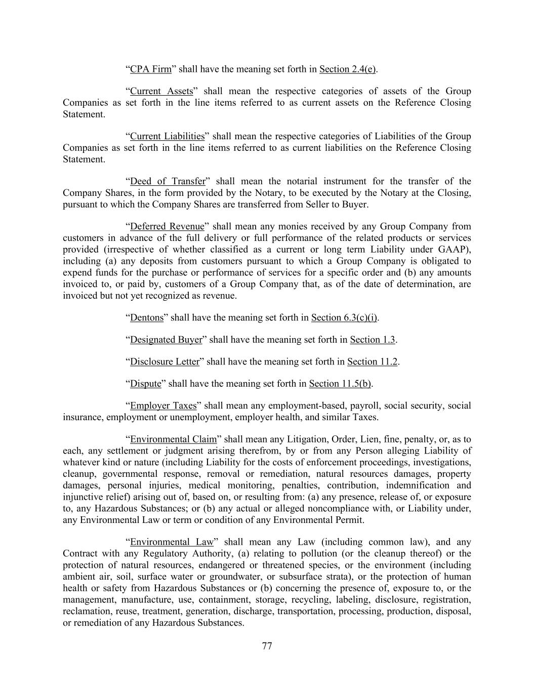 77 “CPA Firm” shall have the meaning set forth in Section 2.4(e). “Current Assets” shall mean the respective categories of assets of the Group Companies as set forth in the line items referred to as current assets on the Reference Closing Statement. “Current Liabilities” shall mean the respective categories of Liabilities of the Group Companies as set forth in the line items referred to as current liabilities on the Reference Closing Statement. “Deed of Transfer” shall mean the notarial instrument for the transfer of the Company Shares, in the form provided by the Notary, to be executed by the Notary at the Closing, pursuant to which the Company Shares are transferred from Seller to Buyer. “Deferred Revenue” shall mean any monies received by any Group Company from customers in advance of the full delivery or full performance of the related products or services provided (irrespective of whether classified as a current or long term Liability under GAAP), including (a) any deposits from customers pursuant to which a Group Company is obligated to expend funds for the purchase or performance of services for a specific order and (b) any amounts invoiced to, or paid by, customers of a Group Company that, as of the date of determination, are invoiced but not yet recognized as revenue. “Dentons” shall have the meaning set forth in Section 6.3(c)(i). “Designated Buyer” shall have the meaning set forth in Section 1.3. “Disclosure Letter” shall have the meaning set forth in Section 11.2. “Dispute” shall have the meaning set forth in Section 11.5(b). “Employer Taxes” shall mean any employment-based, payroll, social security, social insurance, employment or unemployment, employer health, and similar Taxes. “Environmental Claim” shall mean any Litigation, Order, Lien, fine, penalty, or, as to each, any settlement or judgment arising therefrom, by or from any Person alleging Liability of whatever kind or nature (including Liability for the costs of enforcement proceedings, investigations, cleanup, governmental response, removal or remediation, natural resources damages, property damages, personal injuries, medical monitoring, penalties, contribution, indemnification and injunctive relief) arising out of, based on, or resulting from: (a) any presence, release of, or exposure to, any Hazardous Substances; or (b) any actual or alleged noncompliance with, or Liability under, any Environmental Law or term or condition of any Environmental Permit. “Environmental Law” shall mean any Law (including common law), and any Contract with any Regulatory Authority, (a) relating to pollution (or the cleanup thereof) or the protection of natural resources, endangered or threatened species, or the environment (including ambient air, soil, surface water or groundwater, or subsurface strata), or the protection of human health or safety from Hazardous Substances or (b) concerning the presence of, exposure to, or the management, manufacture, use, containment, storage, recycling, labeling, disclosure, registration, reclamation, reuse, treatment, generation, discharge, transportation, processing, production, disposal, or remediation of any Hazardous Substances.