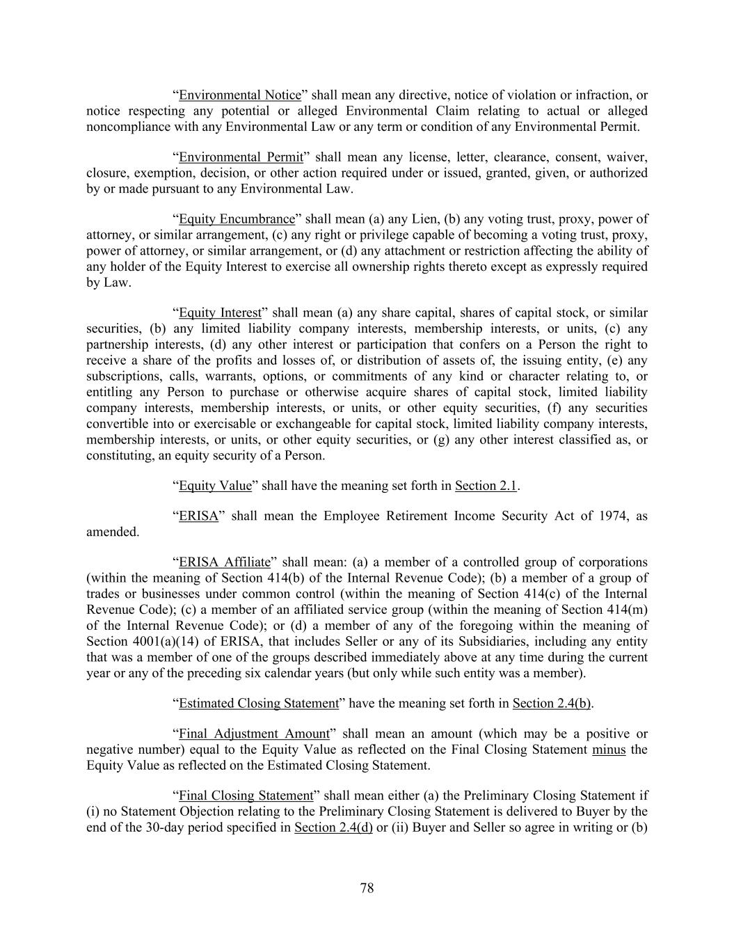 78 “Environmental Notice” shall mean any directive, notice of violation or infraction, or notice respecting any potential or alleged Environmental Claim relating to actual or alleged noncompliance with any Environmental Law or any term or condition of any Environmental Permit. “Environmental Permit” shall mean any license, letter, clearance, consent, waiver, closure, exemption, decision, or other action required under or issued, granted, given, or authorized by or made pursuant to any Environmental Law. “Equity Encumbrance” shall mean (a) any Lien, (b) any voting trust, proxy, power of attorney, or similar arrangement, (c) any right or privilege capable of becoming a voting trust, proxy, power of attorney, or similar arrangement, or (d) any attachment or restriction affecting the ability of any holder of the Equity Interest to exercise all ownership rights thereto except as expressly required by Law. “Equity Interest” shall mean (a) any share capital, shares of capital stock, or similar securities, (b) any limited liability company interests, membership interests, or units, (c) any partnership interests, (d) any other interest or participation that confers on a Person the right to receive a share of the profits and losses of, or distribution of assets of, the issuing entity, (e) any subscriptions, calls, warrants, options, or commitments of any kind or character relating to, or entitling any Person to purchase or otherwise acquire shares of capital stock, limited liability company interests, membership interests, or units, or other equity securities, (f) any securities convertible into or exercisable or exchangeable for capital stock, limited liability company interests, membership interests, or units, or other equity securities, or (g) any other interest classified as, or constituting, an equity security of a Person. “Equity Value” shall have the meaning set forth in Section 2.1. “ERISA” shall mean the Employee Retirement Income Security Act of 1974, as amended. “ERISA Affiliate” shall mean: (a) a member of a controlled group of corporations (within the meaning of Section 414(b) of the Internal Revenue Code); (b) a member of a group of trades or businesses under common control (within the meaning of Section 414(c) of the Internal Revenue Code); (c) a member of an affiliated service group (within the meaning of Section 414(m) of the Internal Revenue Code); or (d) a member of any of the foregoing within the meaning of Section 4001(a)(14) of ERISA, that includes Seller or any of its Subsidiaries, including any entity that was a member of one of the groups described immediately above at any time during the current year or any of the preceding six calendar years (but only while such entity was a member). “Estimated Closing Statement” have the meaning set forth in Section 2.4(b). “Final Adjustment Amount” shall mean an amount (which may be a positive or negative number) equal to the Equity Value as reflected on the Final Closing Statement minus the Equity Value as reflected on the Estimated Closing Statement. “Final Closing Statement” shall mean either (a) the Preliminary Closing Statement if (i) no Statement Objection relating to the Preliminary Closing Statement is delivered to Buyer by the end of the 30-day period specified in Section 2.4(d) or (ii) Buyer and Seller so agree in writing or (b)