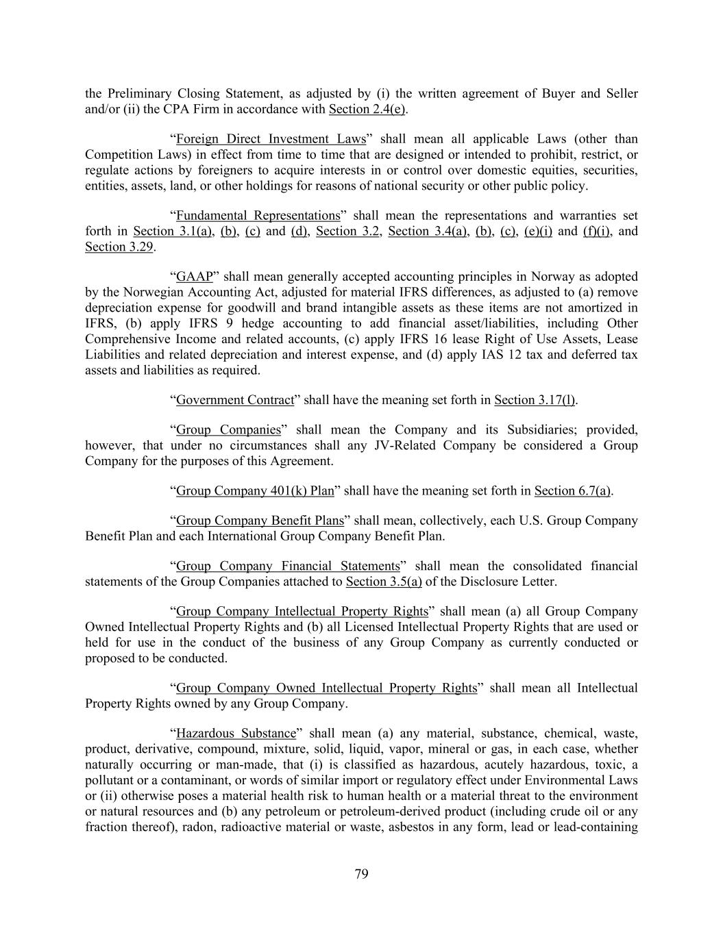 79 the Preliminary Closing Statement, as adjusted by (i) the written agreement of Buyer and Seller and/or (ii) the CPA Firm in accordance with Section 2.4(e). “Foreign Direct Investment Laws” shall mean all applicable Laws (other than Competition Laws) in effect from time to time that are designed or intended to prohibit, restrict, or regulate actions by foreigners to acquire interests in or control over domestic equities, securities, entities, assets, land, or other holdings for reasons of national security or other public policy. “Fundamental Representations” shall mean the representations and warranties set forth in Section 3.1(a), (b), (c) and (d), Section 3.2, Section 3.4(a), (b), (c), (e)(i) and (f)(i), and Section 3.29. “GAAP” shall mean generally accepted accounting principles in Norway as adopted by the Norwegian Accounting Act, adjusted for material IFRS differences, as adjusted to (a) remove depreciation expense for goodwill and brand intangible assets as these items are not amortized in IFRS, (b) apply IFRS 9 hedge accounting to add financial asset/liabilities, including Other Comprehensive Income and related accounts, (c) apply IFRS 16 lease Right of Use Assets, Lease Liabilities and related depreciation and interest expense, and (d) apply IAS 12 tax and deferred tax assets and liabilities as required. “Government Contract” shall have the meaning set forth in Section 3.17(l). “Group Companies” shall mean the Company and its Subsidiaries; provided, however, that under no circumstances shall any JV-Related Company be considered a Group Company for the purposes of this Agreement. “Group Company 401(k) Plan” shall have the meaning set forth in Section 6.7(a). “Group Company Benefit Plans” shall mean, collectively, each U.S. Group Company Benefit Plan and each International Group Company Benefit Plan. “Group Company Financial Statements” shall mean the consolidated financial statements of the Group Companies attached to Section 3.5(a) of the Disclosure Letter. “Group Company Intellectual Property Rights” shall mean (a) all Group Company Owned Intellectual Property Rights and (b) all Licensed Intellectual Property Rights that are used or held for use in the conduct of the business of any Group Company as currently conducted or proposed to be conducted. “Group Company Owned Intellectual Property Rights” shall mean all Intellectual Property Rights owned by any Group Company. “Hazardous Substance” shall mean (a) any material, substance, chemical, waste, product, derivative, compound, mixture, solid, liquid, vapor, mineral or gas, in each case, whether naturally occurring or man-made, that (i) is classified as hazardous, acutely hazardous, toxic, a pollutant or a contaminant, or words of similar import or regulatory effect under Environmental Laws or (ii) otherwise poses a material health risk to human health or a material threat to the environment or natural resources and (b) any petroleum or petroleum-derived product (including crude oil or any fraction thereof), radon, radioactive material or waste, asbestos in any form, lead or lead-containing