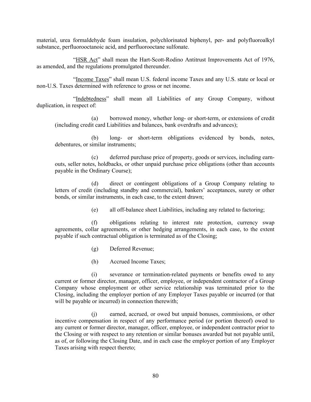80 material, urea formaldehyde foam insulation, polychlorinated biphenyl, per- and polyfluoroalkyl substance, perfluorooctanoic acid, and perfluorooctane sulfonate. “HSR Act” shall mean the Hart-Scott-Rodino Antitrust Improvements Act of 1976, as amended, and the regulations promulgated thereunder. “Income Taxes” shall mean U.S. federal income Taxes and any U.S. state or local or non-U.S. Taxes determined with reference to gross or net income. “Indebtedness” shall mean all Liabilities of any Group Company, without duplication, in respect of: (a) borrowed money, whether long- or short-term, or extensions of credit (including credit card Liabilities and balances, bank overdrafts and advances); (b) long- or short-term obligations evidenced by bonds, notes, debentures, or similar instruments; (c) deferred purchase price of property, goods or services, including earn- outs, seller notes, holdbacks, or other unpaid purchase price obligations (other than accounts payable in the Ordinary Course); (d) direct or contingent obligations of a Group Company relating to letters of credit (including standby and commercial), bankers’ acceptances, surety or other bonds, or similar instruments, in each case, to the extent drawn; (e) all off-balance sheet Liabilities, including any related to factoring; (f) obligations relating to interest rate protection, currency swap agreements, collar agreements, or other hedging arrangements, in each case, to the extent payable if such contractual obligation is terminated as of the Closing; (g) Deferred Revenue; (h) Accrued Income Taxes; (i) severance or termination-related payments or benefits owed to any current or former director, manager, officer, employee, or independent contractor of a Group Company whose employment or other service relationship was terminated prior to the Closing, including the employer portion of any Employer Taxes payable or incurred (or that will be payable or incurred) in connection therewith; (j) earned, accrued, or owed but unpaid bonuses, commissions, or other incentive compensation in respect of any performance period (or portion thereof) owed to any current or former director, manager, officer, employee, or independent contractor prior to the Closing or with respect to any retention or similar bonuses awarded but not payable until, as of, or following the Closing Date, and in each case the employer portion of any Employer Taxes arising with respect thereto;