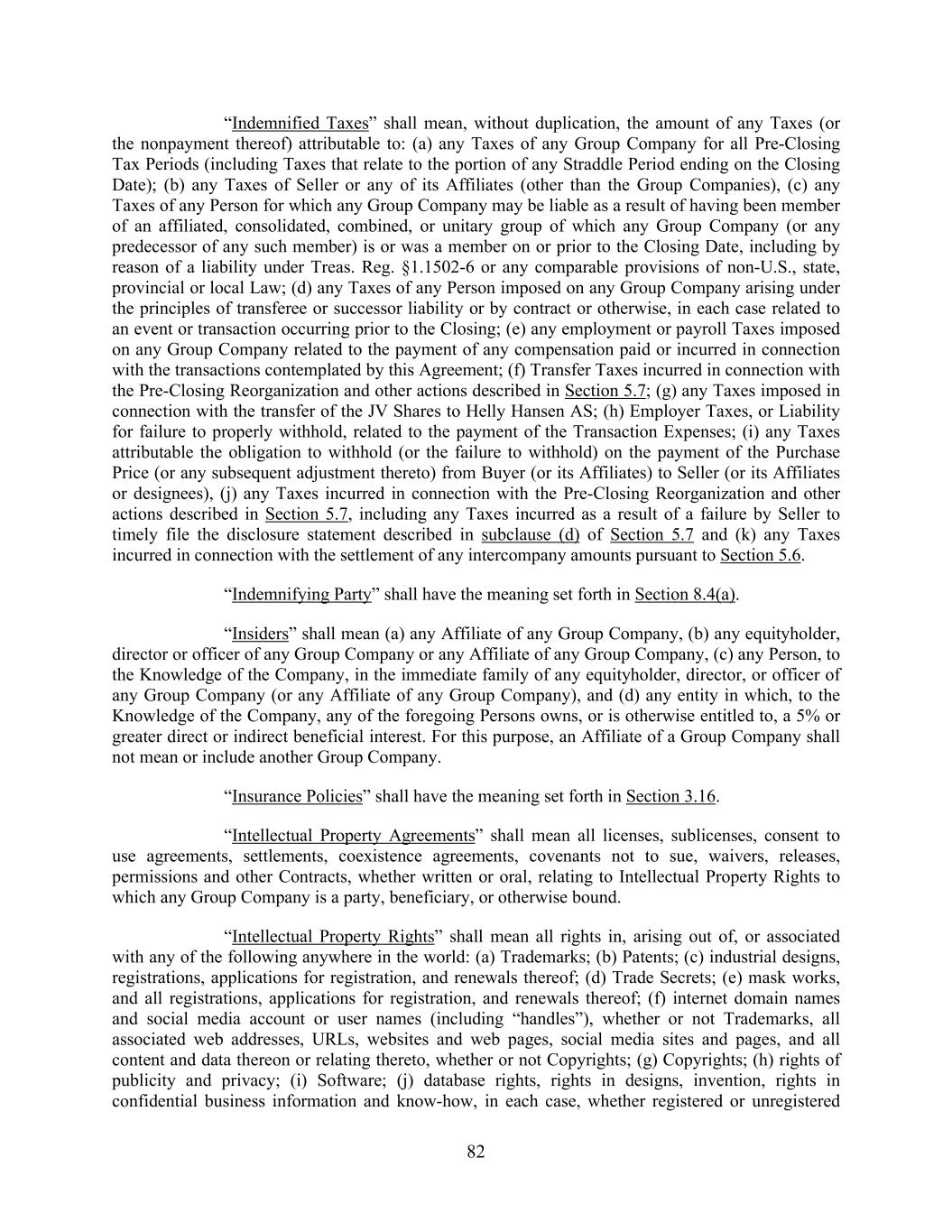 82 “Indemnified Taxes” shall mean, without duplication, the amount of any Taxes (or the nonpayment thereof) attributable to: (a) any Taxes of any Group Company for all Pre-Closing Tax Periods (including Taxes that relate to the portion of any Straddle Period ending on the Closing Date); (b) any Taxes of Seller or any of its Affiliates (other than the Group Companies), (c) any Taxes of any Person for which any Group Company may be liable as a result of having been member of an affiliated, consolidated, combined, or unitary group of which any Group Company (or any predecessor of any such member) is or was a member on or prior to the Closing Date, including by reason of a liability under Treas. Reg. §1.1502-6 or any comparable provisions of non-U.S., state, provincial or local Law; (d) any Taxes of any Person imposed on any Group Company arising under the principles of transferee or successor liability or by contract or otherwise, in each case related to an event or transaction occurring prior to the Closing; (e) any employment or payroll Taxes imposed on any Group Company related to the payment of any compensation paid or incurred in connection with the transactions contemplated by this Agreement; (f) Transfer Taxes incurred in connection with the Pre-Closing Reorganization and other actions described in Section 5.7; (g) any Taxes imposed in connection with the transfer of the JV Shares to Helly Hansen AS; (h) Employer Taxes, or Liability for failure to properly withhold, related to the payment of the Transaction Expenses; (i) any Taxes attributable the obligation to withhold (or the failure to withhold) on the payment of the Purchase Price (or any subsequent adjustment thereto) from Buyer (or its Affiliates) to Seller (or its Affiliates or designees), (j) any Taxes incurred in connection with the Pre-Closing Reorganization and other actions described in Section 5.7, including any Taxes incurred as a result of a failure by Seller to timely file the disclosure statement described in subclause (d) of Section 5.7 and (k) any Taxes incurred in connection with the settlement of any intercompany amounts pursuant to Section 5.6. “Indemnifying Party” shall have the meaning set forth in Section 8.4(a). “Insiders” shall mean (a) any Affiliate of any Group Company, (b) any equityholder, director or officer of any Group Company or any Affiliate of any Group Company, (c) any Person, to the Knowledge of the Company, in the immediate family of any equityholder, director, or officer of any Group Company (or any Affiliate of any Group Company), and (d) any entity in which, to the Knowledge of the Company, any of the foregoing Persons owns, or is otherwise entitled to, a 5% or greater direct or indirect beneficial interest. For this purpose, an Affiliate of a Group Company shall not mean or include another Group Company. “Insurance Policies” shall have the meaning set forth in Section 3.16. “Intellectual Property Agreements” shall mean all licenses, sublicenses, consent to use agreements, settlements, coexistence agreements, covenants not to sue, waivers, releases, permissions and other Contracts, whether written or oral, relating to Intellectual Property Rights to which any Group Company is a party, beneficiary, or otherwise bound. “Intellectual Property Rights” shall mean all rights in, arising out of, or associated with any of the following anywhere in the world: (a) Trademarks; (b) Patents; (c) industrial designs, registrations, applications for registration, and renewals thereof; (d) Trade Secrets; (e) mask works, and all registrations, applications for registration, and renewals thereof; (f) internet domain names and social media account or user names (including “handles”), whether or not Trademarks, all associated web addresses, URLs, websites and web pages, social media sites and pages, and all content and data thereon or relating thereto, whether or not Copyrights; (g) Copyrights; (h) rights of publicity and privacy; (i) Software; (j) database rights, rights in designs, invention, rights in confidential business information and know-how, in each case, whether registered or unregistered