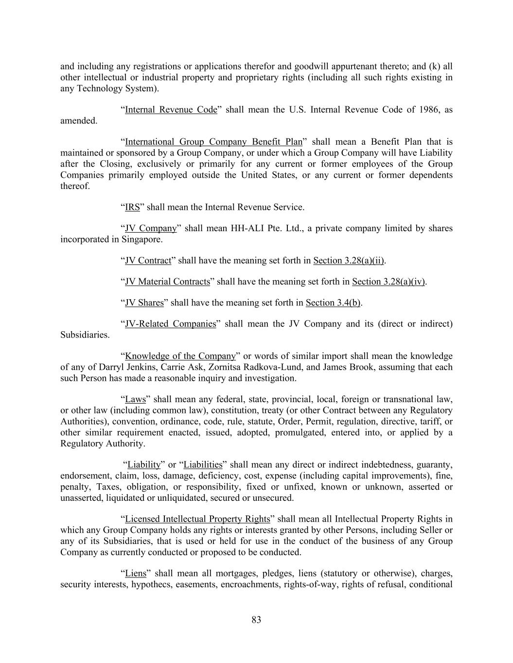 83 and including any registrations or applications therefor and goodwill appurtenant thereto; and (k) all other intellectual or industrial property and proprietary rights (including all such rights existing in any Technology System). “Internal Revenue Code” shall mean the U.S. Internal Revenue Code of 1986, as amended. “International Group Company Benefit Plan” shall mean a Benefit Plan that is maintained or sponsored by a Group Company, or under which a Group Company will have Liability after the Closing, exclusively or primarily for any current or former employees of the Group Companies primarily employed outside the United States, or any current or former dependents thereof. “IRS” shall mean the Internal Revenue Service. “JV Company” shall mean HH-ALI Pte. Ltd., a private company limited by shares incorporated in Singapore. “JV Contract” shall have the meaning set forth in Section 3.28(a)(ii). “JV Material Contracts” shall have the meaning set forth in Section 3.28(a)(iv). “JV Shares” shall have the meaning set forth in Section 3.4(b). “JV-Related Companies” shall mean the JV Company and its (direct or indirect) Subsidiaries. “Knowledge of the Company” or words of similar import shall mean the knowledge of any of Darryl Jenkins, Carrie Ask, Zornitsa Radkova-Lund, and James Brook, assuming that each such Person has made a reasonable inquiry and investigation. “Laws” shall mean any federal, state, provincial, local, foreign or transnational law, or other law (including common law), constitution, treaty (or other Contract between any Regulatory Authorities), convention, ordinance, code, rule, statute, Order, Permit, regulation, directive, tariff, or other similar requirement enacted, issued, adopted, promulgated, entered into, or applied by a Regulatory Authority. “Liability” or “Liabilities” shall mean any direct or indirect indebtedness, guaranty, endorsement, claim, loss, damage, deficiency, cost, expense (including capital improvements), fine, penalty, Taxes, obligation, or responsibility, fixed or unfixed, known or unknown, asserted or unasserted, liquidated or unliquidated, secured or unsecured. “Licensed Intellectual Property Rights” shall mean all Intellectual Property Rights in which any Group Company holds any rights or interests granted by other Persons, including Seller or any of its Subsidiaries, that is used or held for use in the conduct of the business of any Group Company as currently conducted or proposed to be conducted. “Liens” shall mean all mortgages, pledges, liens (statutory or otherwise), charges, security interests, hypothecs, easements, encroachments, rights-of-way, rights of refusal, conditional