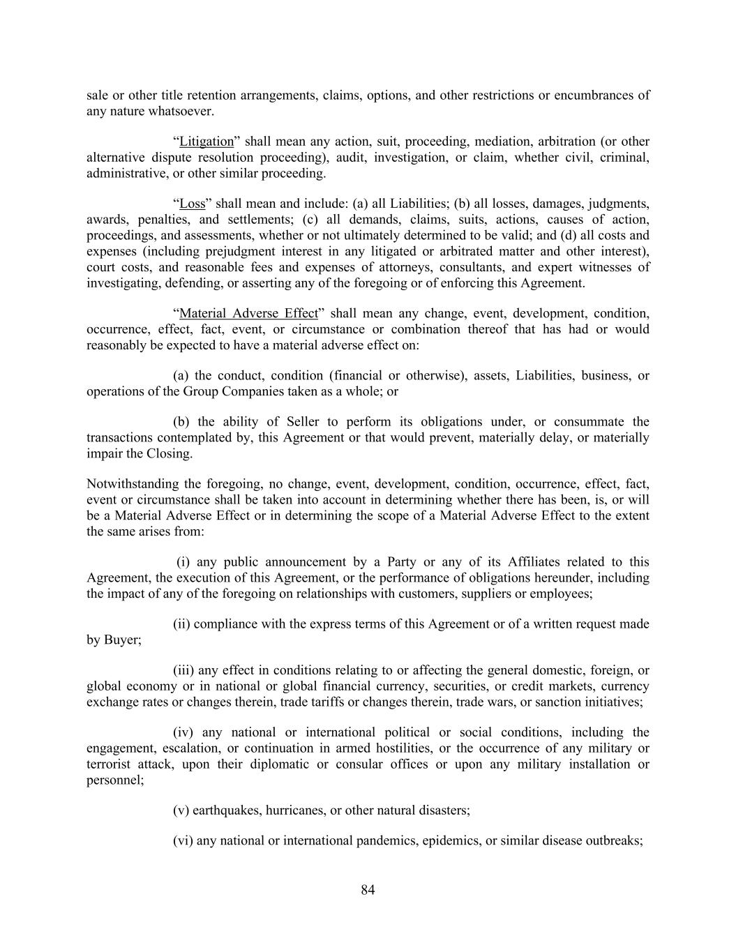 84 sale or other title retention arrangements, claims, options, and other restrictions or encumbrances of any nature whatsoever. “Litigation” shall mean any action, suit, proceeding, mediation, arbitration (or other alternative dispute resolution proceeding), audit, investigation, or claim, whether civil, criminal, administrative, or other similar proceeding. “Loss” shall mean and include: (a) all Liabilities; (b) all losses, damages, judgments, awards, penalties, and settlements; (c) all demands, claims, suits, actions, causes of action, proceedings, and assessments, whether or not ultimately determined to be valid; and (d) all costs and expenses (including prejudgment interest in any litigated or arbitrated matter and other interest), court costs, and reasonable fees and expenses of attorneys, consultants, and expert witnesses of investigating, defending, or asserting any of the foregoing or of enforcing this Agreement. “Material Adverse Effect” shall mean any change, event, development, condition, occurrence, effect, fact, event, or circumstance or combination thereof that has had or would reasonably be expected to have a material adverse effect on: (a) the conduct, condition (financial or otherwise), assets, Liabilities, business, or operations of the Group Companies taken as a whole; or (b) the ability of Seller to perform its obligations under, or consummate the transactions contemplated by, this Agreement or that would prevent, materially delay, or materially impair the Closing. Notwithstanding the foregoing, no change, event, development, condition, occurrence, effect, fact, event or circumstance shall be taken into account in determining whether there has been, is, or will be a Material Adverse Effect or in determining the scope of a Material Adverse Effect to the extent the same arises from: (i) any public announcement by a Party or any of its Affiliates related to this Agreement, the execution of this Agreement, or the performance of obligations hereunder, including the impact of any of the foregoing on relationships with customers, suppliers or employees; (ii) compliance with the express terms of this Agreement or of a written request made by Buyer; (iii) any effect in conditions relating to or affecting the general domestic, foreign, or global economy or in national or global financial currency, securities, or credit markets, currency exchange rates or changes therein, trade tariffs or changes therein, trade wars, or sanction initiatives; (iv) any national or international political or social conditions, including the engagement, escalation, or continuation in armed hostilities, or the occurrence of any military or terrorist attack, upon their diplomatic or consular offices or upon any military installation or personnel; (v) earthquakes, hurricanes, or other natural disasters; (vi) any national or international pandemics, epidemics, or similar disease outbreaks;