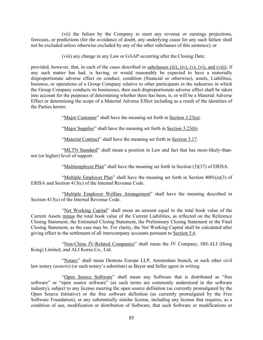 85 (vii) the failure by the Company to meet any revenue or earnings projections, forecasts, or predictions (for the avoidance of doubt, any underlying cause for any such failure shall not be excluded unless otherwise excluded by any of the other subclauses of this sentence); or (viii) any change in any Law or GAAP occurring after the Closing Date; provided, however, that, in each of the cases described in subclauses (iii), (iv), (v), (vi), and (viii), if any such matter has had, is having, or would reasonably be expected to have a materially disproportionate adverse effect on conduct, condition (financial or otherwise), assets, Liabilities, business, or operations of a Group Company relative to other participants in the industries in which the Group Company conducts its businesses, then such disproportionate adverse effect shall be taken into account for the purposes of determining whether there has been, is, or will be a Material Adverse Effect or determining the scope of a Material Adverse Effect including as a result of the identities of the Parties hereto. “Major Customer” shall have the meaning set forth in Section 3.23(a). “Major Supplier” shall have the meaning set forth in Section 3.23(b). “Material Contract” shall have the meaning set forth in Section 3.17. “MLTN Standard” shall mean a position in Law and fact that has more-likely-than- not (or higher) level of support. “Multiemployer Plan” shall have the meaning set forth in Section (3)(37) of ERISA. “Multiple Employer Plan” shall have the meaning set forth in Section 4001(a)(3) of ERISA and Section 413(c) of the Internal Revenue Code. “Multiple Employer Welfare Arrangement” shall have the meaning described in Section 413(c) of the Internal Revenue Code. “Net Working Capital” shall mean an amount equal to the total book value of the Current Assets minus the total book value of the Current Liabilities, as reflected on the Reference Closing Statement, the Estimated Closing Statement, the Preliminary Closing Statement or the Final Closing Statement, as the case may be. For clarity, the Net Working Capital shall be calculated after giving effect to the settlement of all intercompany accounts pursuant to Section 5.6. “Non-China JV-Related Companies” shall mean the JV Company, HH-ALI (Hong Kong) Limited, and ALI Korea Co., Ltd. “Notary” shall mean Dentons Europe LLP, Amsterdam branch, or such other civil law notary (notaris) (or such notary’s substitute) as Buyer and Seller agree in writing. “Open Source Software” shall mean any Software that is distributed as “free software” or “open source software” (as such terms are commonly understood in the software industry), subject to any license meeting the open source definition (as currently promulgated by the Open Source Initiative) or the free software definition (as currently promulgated by the Free Software Foundation), or any substantially similar license, including any license that requires, as a condition of use, modification or distribution of Software, that such Software or modifications or
