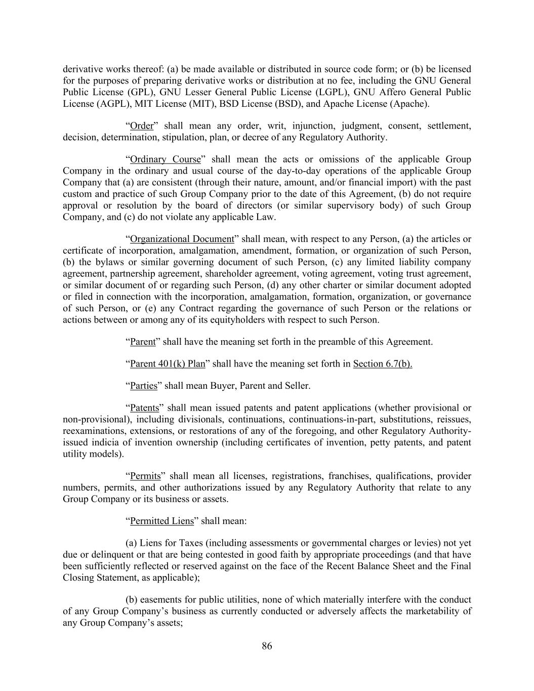 86 derivative works thereof: (a) be made available or distributed in source code form; or (b) be licensed for the purposes of preparing derivative works or distribution at no fee, including the GNU General Public License (GPL), GNU Lesser General Public License (LGPL), GNU Affero General Public License (AGPL), MIT License (MIT), BSD License (BSD), and Apache License (Apache). “Order” shall mean any order, writ, injunction, judgment, consent, settlement, decision, determination, stipulation, plan, or decree of any Regulatory Authority. “Ordinary Course” shall mean the acts or omissions of the applicable Group Company in the ordinary and usual course of the day-to-day operations of the applicable Group Company that (a) are consistent (through their nature, amount, and/or financial import) with the past custom and practice of such Group Company prior to the date of this Agreement, (b) do not require approval or resolution by the board of directors (or similar supervisory body) of such Group Company, and (c) do not violate any applicable Law. “Organizational Document” shall mean, with respect to any Person, (a) the articles or certificate of incorporation, amalgamation, amendment, formation, or organization of such Person, (b) the bylaws or similar governing document of such Person, (c) any limited liability company agreement, partnership agreement, shareholder agreement, voting agreement, voting trust agreement, or similar document of or regarding such Person, (d) any other charter or similar document adopted or filed in connection with the incorporation, amalgamation, formation, organization, or governance of such Person, or (e) any Contract regarding the governance of such Person or the relations or actions between or among any of its equityholders with respect to such Person. “Parent” shall have the meaning set forth in the preamble of this Agreement. “Parent 401(k) Plan” shall have the meaning set forth in Section 6.7(b). “Parties” shall mean Buyer, Parent and Seller. “Patents” shall mean issued patents and patent applications (whether provisional or non-provisional), including divisionals, continuations, continuations-in-part, substitutions, reissues, reexaminations, extensions, or restorations of any of the foregoing, and other Regulatory Authority- issued indicia of invention ownership (including certificates of invention, petty patents, and patent utility models). “Permits” shall mean all licenses, registrations, franchises, qualifications, provider numbers, permits, and other authorizations issued by any Regulatory Authority that relate to any Group Company or its business or assets. “Permitted Liens” shall mean: (a) Liens for Taxes (including assessments or governmental charges or levies) not yet due or delinquent or that are being contested in good faith by appropriate proceedings (and that have been sufficiently reflected or reserved against on the face of the Recent Balance Sheet and the Final Closing Statement, as applicable); (b) easements for public utilities, none of which materially interfere with the conduct of any Group Company’s business as currently conducted or adversely affects the marketability of any Group Company’s assets;