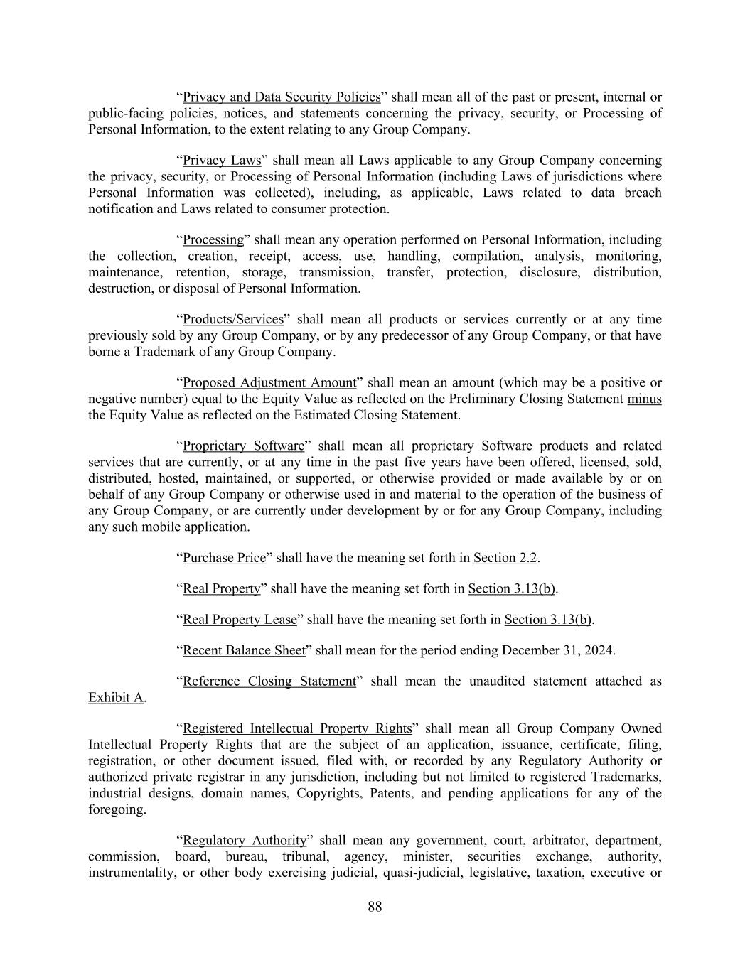 88 “Privacy and Data Security Policies” shall mean all of the past or present, internal or public-facing policies, notices, and statements concerning the privacy, security, or Processing of Personal Information, to the extent relating to any Group Company. “Privacy Laws” shall mean all Laws applicable to any Group Company concerning the privacy, security, or Processing of Personal Information (including Laws of jurisdictions where Personal Information was collected), including, as applicable, Laws related to data breach notification and Laws related to consumer protection. “Processing” shall mean any operation performed on Personal Information, including the collection, creation, receipt, access, use, handling, compilation, analysis, monitoring, maintenance, retention, storage, transmission, transfer, protection, disclosure, distribution, destruction, or disposal of Personal Information. “Products/Services” shall mean all products or services currently or at any time previously sold by any Group Company, or by any predecessor of any Group Company, or that have borne a Trademark of any Group Company. “Proposed Adjustment Amount” shall mean an amount (which may be a positive or negative number) equal to the Equity Value as reflected on the Preliminary Closing Statement minus the Equity Value as reflected on the Estimated Closing Statement. “Proprietary Software” shall mean all proprietary Software products and related services that are currently, or at any time in the past five years have been offered, licensed, sold, distributed, hosted, maintained, or supported, or otherwise provided or made available by or on behalf of any Group Company or otherwise used in and material to the operation of the business of any Group Company, or are currently under development by or for any Group Company, including any such mobile application. “Purchase Price” shall have the meaning set forth in Section 2.2. “Real Property” shall have the meaning set forth in Section 3.13(b). “Real Property Lease” shall have the meaning set forth in Section 3.13(b). “Recent Balance Sheet” shall mean for the period ending December 31, 2024. “Reference Closing Statement” shall mean the unaudited statement attached as Exhibit A. “Registered Intellectual Property Rights” shall mean all Group Company Owned Intellectual Property Rights that are the subject of an application, issuance, certificate, filing, registration, or other document issued, filed with, or recorded by any Regulatory Authority or authorized private registrar in any jurisdiction, including but not limited to registered Trademarks, industrial designs, domain names, Copyrights, Patents, and pending applications for any of the foregoing. “Regulatory Authority” shall mean any government, court, arbitrator, department, commission, board, bureau, tribunal, agency, minister, securities exchange, authority, instrumentality, or other body exercising judicial, quasi-judicial, legislative, taxation, executive or