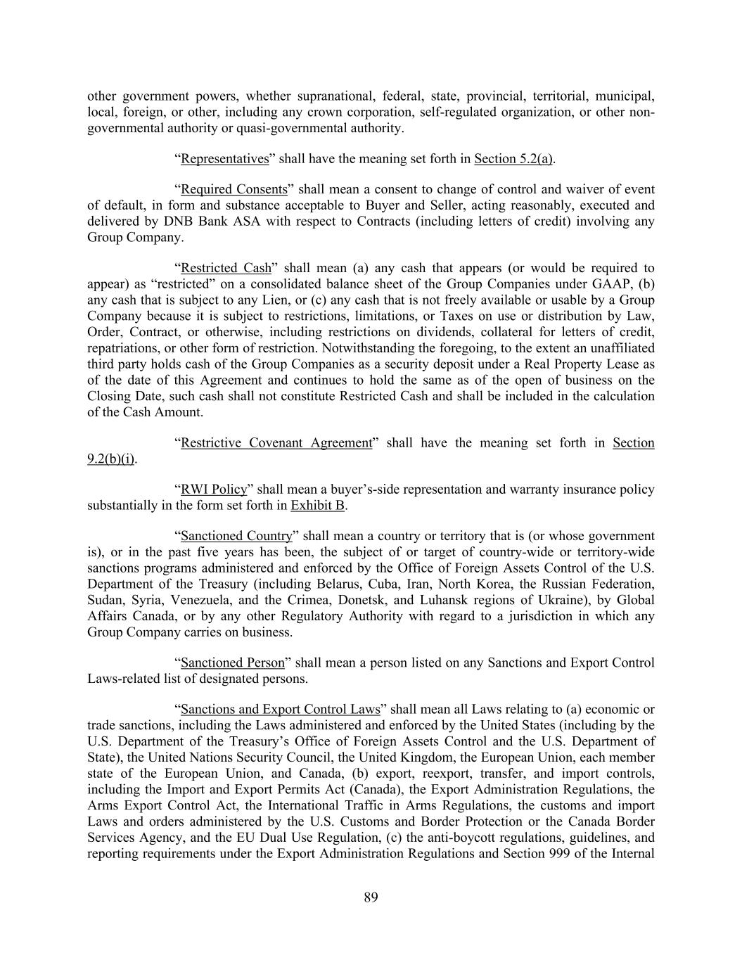 89 other government powers, whether supranational, federal, state, provincial, territorial, municipal, local, foreign, or other, including any crown corporation, self-regulated organization, or other non- governmental authority or quasi-governmental authority. “Representatives” shall have the meaning set forth in Section 5.2(a). “Required Consents” shall mean a consent to change of control and waiver of event of default, in form and substance acceptable to Buyer and Seller, acting reasonably, executed and delivered by DNB Bank ASA with respect to Contracts (including letters of credit) involving any Group Company. “Restricted Cash” shall mean (a) any cash that appears (or would be required to appear) as “restricted” on a consolidated balance sheet of the Group Companies under GAAP, (b) any cash that is subject to any Lien, or (c) any cash that is not freely available or usable by a Group Company because it is subject to restrictions, limitations, or Taxes on use or distribution by Law, Order, Contract, or otherwise, including restrictions on dividends, collateral for letters of credit, repatriations, or other form of restriction. Notwithstanding the foregoing, to the extent an unaffiliated third party holds cash of the Group Companies as a security deposit under a Real Property Lease as of the date of this Agreement and continues to hold the same as of the open of business on the Closing Date, such cash shall not constitute Restricted Cash and shall be included in the calculation of the Cash Amount. “Restrictive Covenant Agreement” shall have the meaning set forth in Section 9.2(b)(i). “RWI Policy” shall mean a buyer’s-side representation and warranty insurance policy substantially in the form set forth in Exhibit B. “Sanctioned Country” shall mean a country or territory that is (or whose government is), or in the past five years has been, the subject of or target of country-wide or territory-wide sanctions programs administered and enforced by the Office of Foreign Assets Control of the U.S. Department of the Treasury (including Belarus, Cuba, Iran, North Korea, the Russian Federation, Sudan, Syria, Venezuela, and the Crimea, Donetsk, and Luhansk regions of Ukraine), by Global Affairs Canada, or by any other Regulatory Authority with regard to a jurisdiction in which any Group Company carries on business. “Sanctioned Person” shall mean a person listed on any Sanctions and Export Control Laws-related list of designated persons. “Sanctions and Export Control Laws” shall mean all Laws relating to (a) economic or trade sanctions, including the Laws administered and enforced by the United States (including by the U.S. Department of the Treasury’s Office of Foreign Assets Control and the U.S. Department of State), the United Nations Security Council, the United Kingdom, the European Union, each member state of the European Union, and Canada, (b) export, reexport, transfer, and import controls, including the Import and Export Permits Act (Canada), the Export Administration Regulations, the Arms Export Control Act, the International Traffic in Arms Regulations, the customs and import Laws and orders administered by the U.S. Customs and Border Protection or the Canada Border Services Agency, and the EU Dual Use Regulation, (c) the anti-boycott regulations, guidelines, and reporting requirements under the Export Administration Regulations and Section 999 of the Internal
