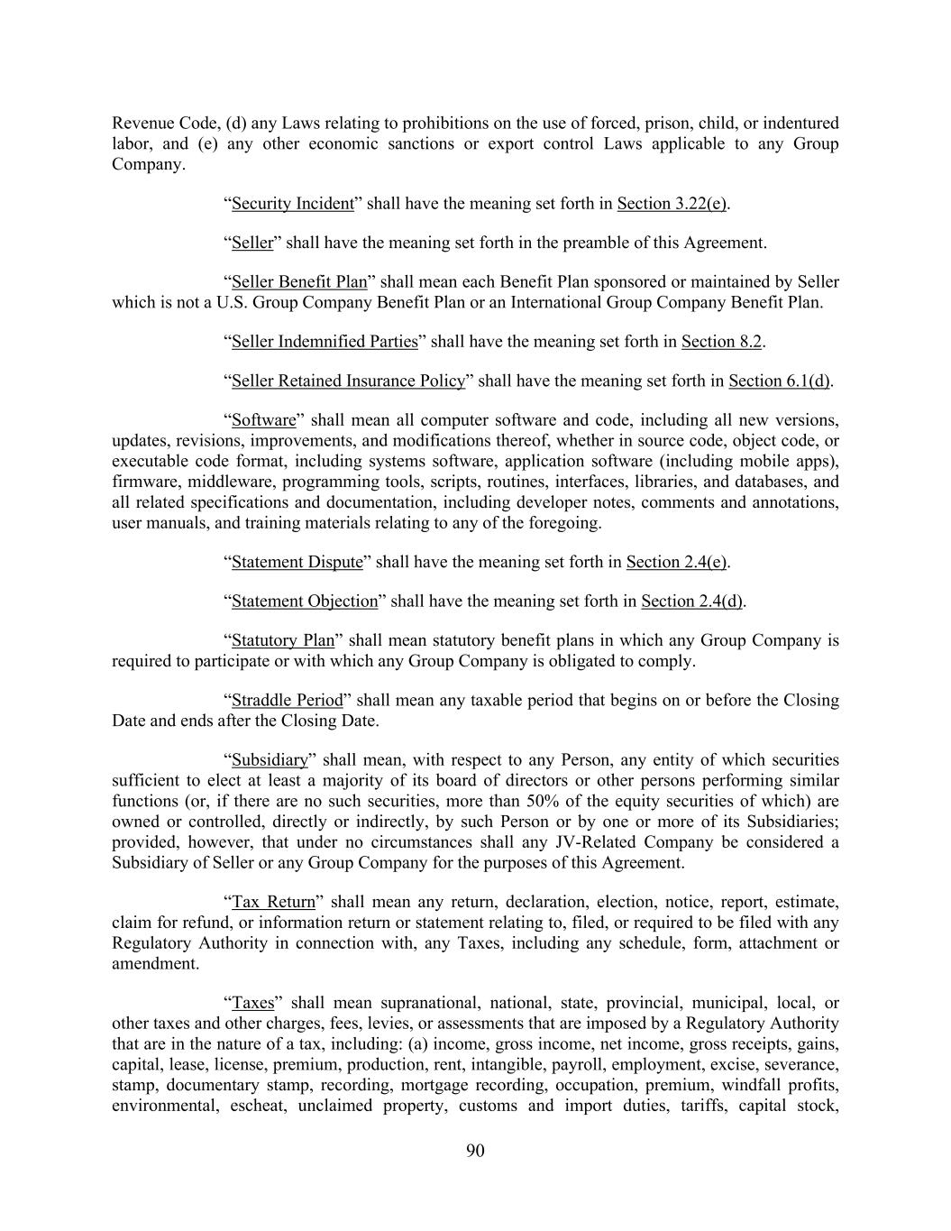 90 Revenue Code, (d) any Laws relating to prohibitions on the use of forced, prison, child, or indentured labor, and (e) any other economic sanctions or export control Laws applicable to any Group Company. “Security Incident” shall have the meaning set forth in Section 3.22(e). “Seller” shall have the meaning set forth in the preamble of this Agreement. “Seller Benefit Plan” shall mean each Benefit Plan sponsored or maintained by Seller which is not a U.S. Group Company Benefit Plan or an International Group Company Benefit Plan. “Seller Indemnified Parties” shall have the meaning set forth in Section 8.2. “Seller Retained Insurance Policy” shall have the meaning set forth in Section 6.1(d). “Software” shall mean all computer software and code, including all new versions, updates, revisions, improvements, and modifications thereof, whether in source code, object code, or executable code format, including systems software, application software (including mobile apps), firmware, middleware, programming tools, scripts, routines, interfaces, libraries, and databases, and all related specifications and documentation, including developer notes, comments and annotations, user manuals, and training materials relating to any of the foregoing. “Statement Dispute” shall have the meaning set forth in Section 2.4(e). “Statement Objection” shall have the meaning set forth in Section 2.4(d). “Statutory Plan” shall mean statutory benefit plans in which any Group Company is required to participate or with which any Group Company is obligated to comply. “Straddle Period” shall mean any taxable period that begins on or before the Closing Date and ends after the Closing Date. “Subsidiary” shall mean, with respect to any Person, any entity of which securities sufficient to elect at least a majority of its board of directors or other persons performing similar functions (or, if there are no such securities, more than 50% of the equity securities of which) are owned or controlled, directly or indirectly, by such Person or by one or more of its Subsidiaries; provided, however, that under no circumstances shall any JV-Related Company be considered a Subsidiary of Seller or any Group Company for the purposes of this Agreement. “Tax Return” shall mean any return, declaration, election, notice, report, estimate, claim for refund, or information return or statement relating to, filed, or required to be filed with any Regulatory Authority in connection with, any Taxes, including any schedule, form, attachment or amendment. “Taxes” shall mean supranational, national, state, provincial, municipal, local, or other taxes and other charges, fees, levies, or assessments that are imposed by a Regulatory Authority that are in the nature of a tax, including: (a) income, gross income, net income, gross receipts, gains, capital, lease, license, premium, production, rent, intangible, payroll, employment, excise, severance, stamp, documentary stamp, recording, mortgage recording, occupation, premium, windfall profits, environmental, escheat, unclaimed property, customs and import duties, tariffs, capital stock,
