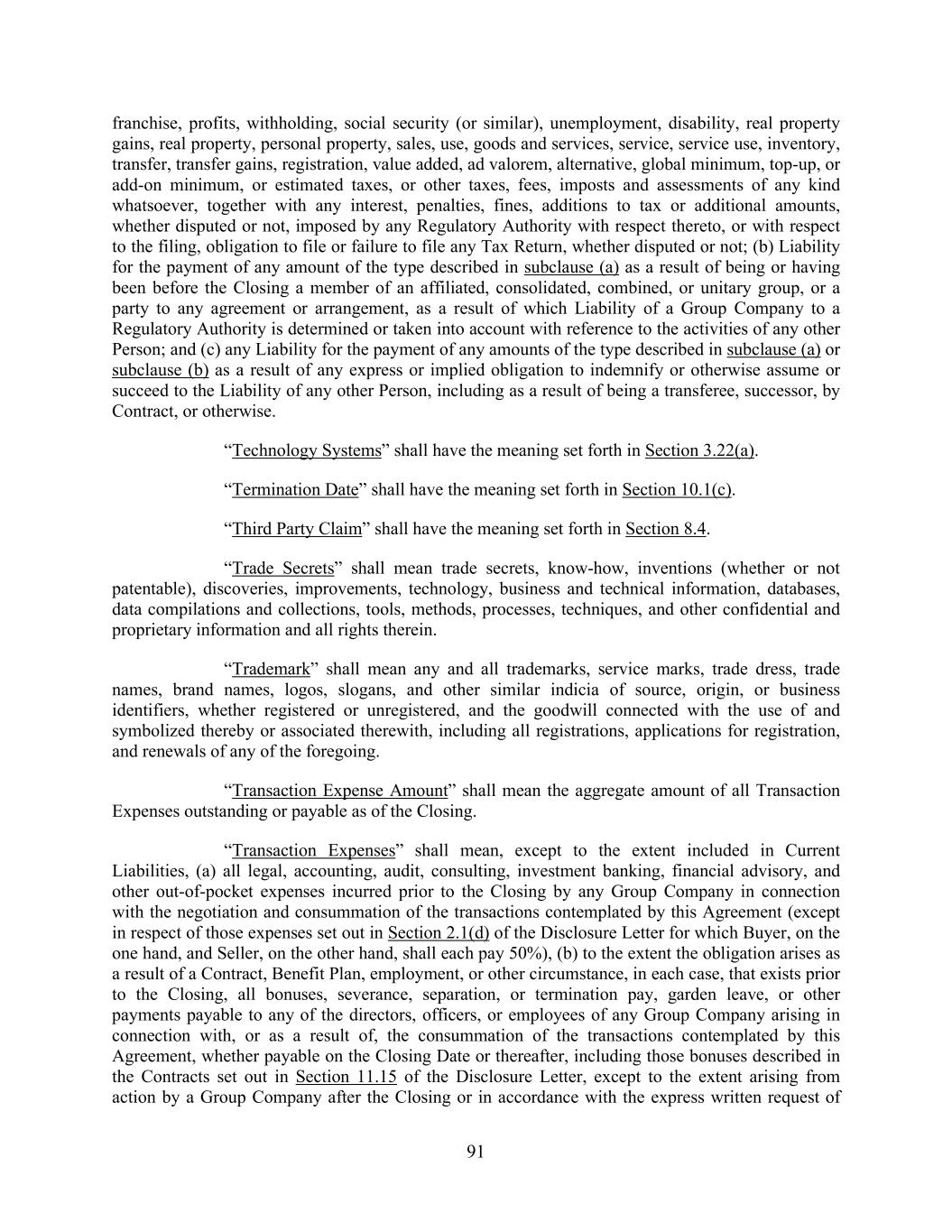 91 franchise, profits, withholding, social security (or similar), unemployment, disability, real property gains, real property, personal property, sales, use, goods and services, service, service use, inventory, transfer, transfer gains, registration, value added, ad valorem, alternative, global minimum, top-up, or add-on minimum, or estimated taxes, or other taxes, fees, imposts and assessments of any kind whatsoever, together with any interest, penalties, fines, additions to tax or additional amounts, whether disputed or not, imposed by any Regulatory Authority with respect thereto, or with respect to the filing, obligation to file or failure to file any Tax Return, whether disputed or not; (b) Liability for the payment of any amount of the type described in subclause (a) as a result of being or having been before the Closing a member of an affiliated, consolidated, combined, or unitary group, or a party to any agreement or arrangement, as a result of which Liability of a Group Company to a Regulatory Authority is determined or taken into account with reference to the activities of any other Person; and (c) any Liability for the payment of any amounts of the type described in subclause (a) or subclause (b) as a result of any express or implied obligation to indemnify or otherwise assume or succeed to the Liability of any other Person, including as a result of being a transferee, successor, by Contract, or otherwise. “Technology Systems” shall have the meaning set forth in Section 3.22(a). “Termination Date” shall have the meaning set forth in Section 10.1(c). “Third Party Claim” shall have the meaning set forth in Section 8.4. “Trade Secrets” shall mean trade secrets, know-how, inventions (whether or not patentable), discoveries, improvements, technology, business and technical information, databases, data compilations and collections, tools, methods, processes, techniques, and other confidential and proprietary information and all rights therein. “Trademark” shall mean any and all trademarks, service marks, trade dress, trade names, brand names, logos, slogans, and other similar indicia of source, origin, or business identifiers, whether registered or unregistered, and the goodwill connected with the use of and symbolized thereby or associated therewith, including all registrations, applications for registration, and renewals of any of the foregoing. “Transaction Expense Amount” shall mean the aggregate amount of all Transaction Expenses outstanding or payable as of the Closing. “Transaction Expenses” shall mean, except to the extent included in Current Liabilities, (a) all legal, accounting, audit, consulting, investment banking, financial advisory, and other out-of-pocket expenses incurred prior to the Closing by any Group Company in connection with the negotiation and consummation of the transactions contemplated by this Agreement (except in respect of those expenses set out in Section 2.1(d) of the Disclosure Letter for which Buyer, on the one hand, and Seller, on the other hand, shall each pay 50%), (b) to the extent the obligation arises as a result of a Contract, Benefit Plan, employment, or other circumstance, in each case, that exists prior to the Closing, all bonuses, severance, separation, or termination pay, garden leave, or other payments payable to any of the directors, officers, or employees of any Group Company arising in connection with, or as a result of, the consummation of the transactions contemplated by this Agreement, whether payable on the Closing Date or thereafter, including those bonuses described in the Contracts set out in Section 11.15 of the Disclosure Letter, except to the extent arising from action by a Group Company after the Closing or in accordance with the express written request of