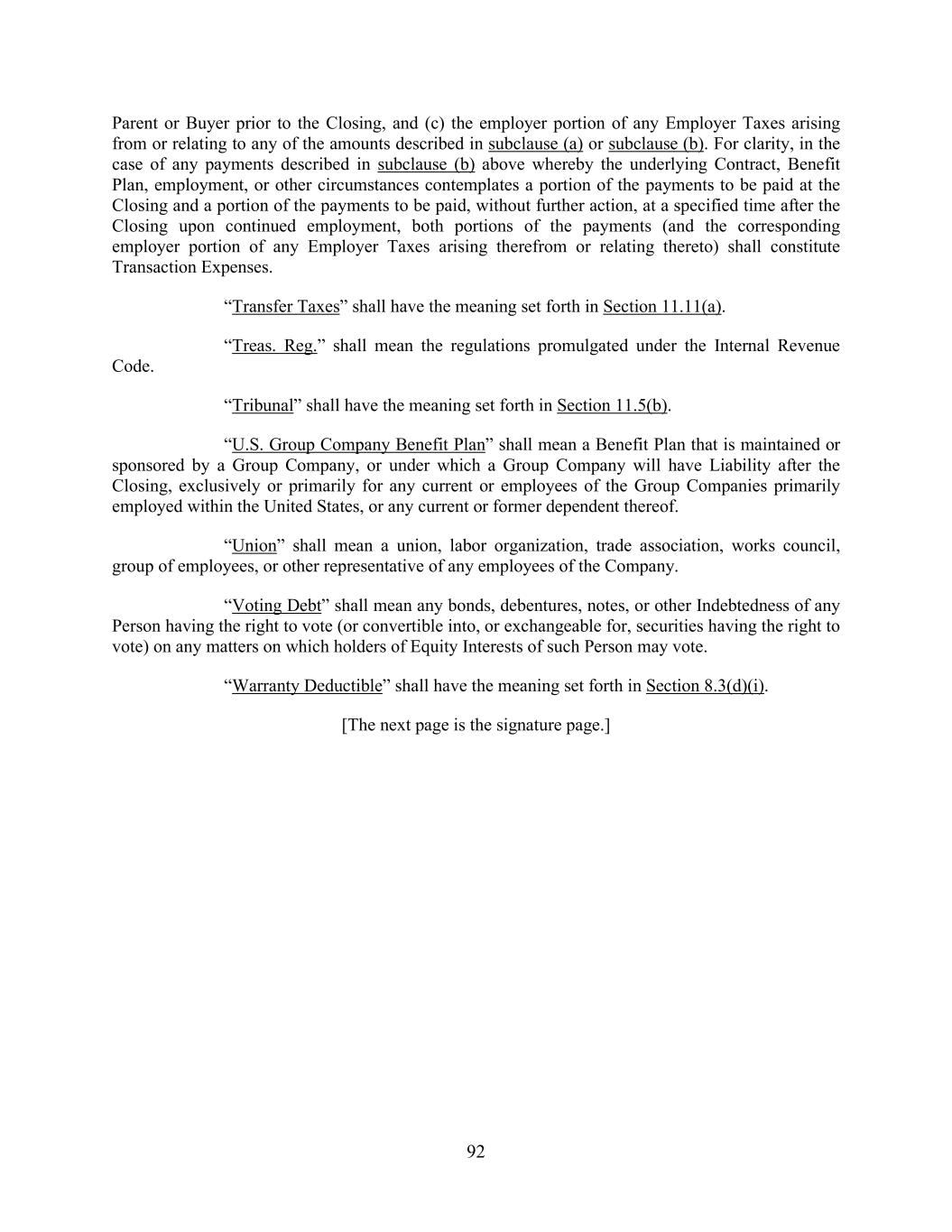 92 Parent or Buyer prior to the Closing, and (c) the employer portion of any Employer Taxes arising from or relating to any of the amounts described in subclause (a) or subclause (b). For clarity, in the case of any payments described in subclause (b) above whereby the underlying Contract, Benefit Plan, employment, or other circumstances contemplates a portion of the payments to be paid at the Closing and a portion of the payments to be paid, without further action, at a specified time after the Closing upon continued employment, both portions of the payments (and the corresponding employer portion of any Employer Taxes arising therefrom or relating thereto) shall constitute Transaction Expenses. “Transfer Taxes” shall have the meaning set forth in Section 11.11(a). “Treas. Reg.” shall mean the regulations promulgated under the Internal Revenue Code. “Tribunal” shall have the meaning set forth in Section 11.5(b). “U.S. Group Company Benefit Plan” shall mean a Benefit Plan that is maintained or sponsored by a Group Company, or under which a Group Company will have Liability after the Closing, exclusively or primarily for any current or employees of the Group Companies primarily employed within the United States, or any current or former dependent thereof. “Union” shall mean a union, labor organization, trade association, works council, group of employees, or other representative of any employees of the Company. “Voting Debt” shall mean any bonds, debentures, notes, or other Indebtedness of any Person having the right to vote (or convertible into, or exchangeable for, securities having the right to vote) on any matters on which holders of Equity Interests of such Person may vote. “Warranty Deductible” shall have the meaning set forth in Section 8.3(d)(i). [The next page is the signature page.]