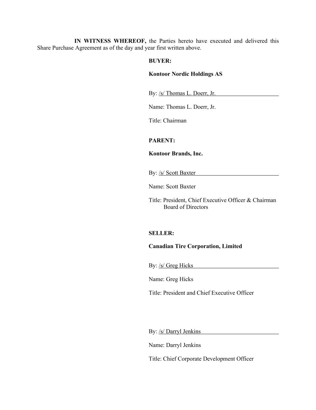 IN WITNESS WHEREOF, the Parties hereto have executed and delivered this Share Purchase Agreement as of the day and year first written above. BUYER: Kontoor Nordic Holdings AS By: /s/ Thomas L. Doerr, Jr. Name: Thomas L. Doerr, Jr. Title: Chairman PARENT: Kontoor Brands, Inc. By: /s/ Scott Baxter Name: Scott Baxter Title: President, Chief Executive Officer & Chairman _____Board of Directors SELLER: Canadian Tire Corporation, Limited By: /s/ Greg Hicks Name: Greg Hicks Title: President and Chief Executive Officer By: /s/ Darryl Jenkins Name: Darryl Jenkins Title: Chief Corporate Development Officer