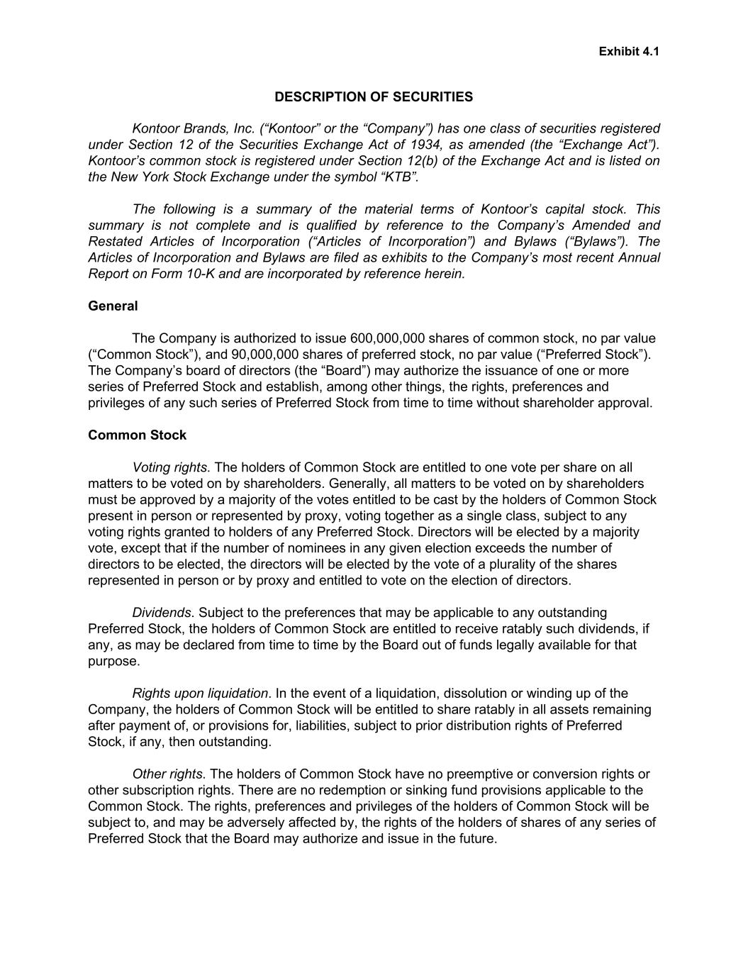Exhibit 4.1 DESCRIPTION OF SECURITIES Kontoor Brands, Inc. (“Kontoor” or the “Company”) has one class of securities registered under Section 12 of the Securities Exchange Act of 1934, as amended (the “Exchange Act”). Kontoor’s common stock is registered under Section 12(b) of the Exchange Act and is listed on the New York Stock Exchange under the symbol “KTB”. The following is a summary of the material terms of Kontoor’s capital stock. This summary is not complete and is qualified by reference to the Company’s Amended and Restated Articles of Incorporation (“Articles of Incorporation”) and Bylaws (“Bylaws”). The Articles of Incorporation and Bylaws are filed as exhibits to the Company’s most recent Annual Report on Form 10-K and are incorporated by reference herein. General The Company is authorized to issue 600,000,000 shares of common stock, no par value (“Common Stock”), and 90,000,000 shares of preferred stock, no par value (“Preferred Stock”). The Company’s board of directors (the “Board”) may authorize the issuance of one or more series of Preferred Stock and establish, among other things, the rights, preferences and privileges of any such series of Preferred Stock from time to time without shareholder approval. Common Stock Voting rights. The holders of Common Stock are entitled to one vote per share on all matters to be voted on by shareholders. Generally, all matters to be voted on by shareholders must be approved by a majority of the votes entitled to be cast by the holders of Common Stock present in person or represented by proxy, voting together as a single class, subject to any voting rights granted to holders of any Preferred Stock. Directors will be elected by a majority vote, except that if the number of nominees in any given election exceeds the number of directors to be elected, the directors will be elected by the vote of a plurality of the shares represented in person or by proxy and entitled to vote on the election of directors. Dividends. Subject to the preferences that may be applicable to any outstanding Preferred Stock, the holders of Common Stock are entitled to receive ratably such dividends, if any, as may be declared from time to time by the Board out of funds legally available for that purpose. Rights upon liquidation. In the event of a liquidation, dissolution or winding up of the Company, the holders of Common Stock will be entitled to share ratably in all assets remaining after payment of, or provisions for, liabilities, subject to prior distribution rights of Preferred Stock, if any, then outstanding. Other rights. The holders of Common Stock have no preemptive or conversion rights or other subscription rights. There are no redemption or sinking fund provisions applicable to the Common Stock. The rights, preferences and privileges of the holders of Common Stock will be subject to, and may be adversely affected by, the rights of the holders of shares of any series of Preferred Stock that the Board may authorize and issue in the future.