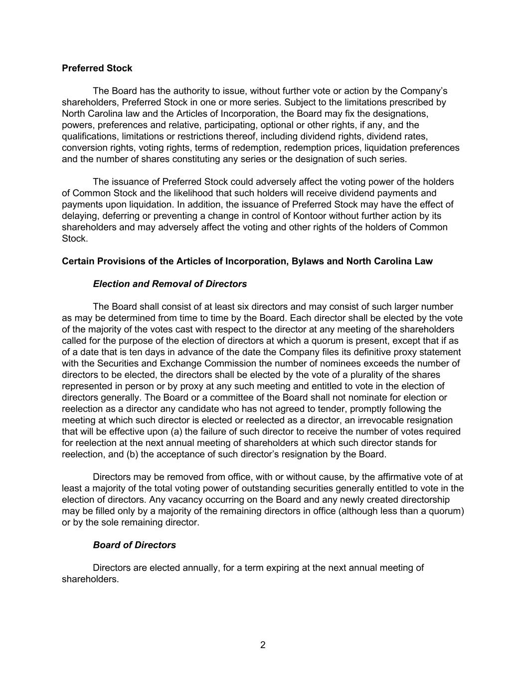 2 Preferred Stock The Board has the authority to issue, without further vote or action by the Company’s shareholders, Preferred Stock in one or more series. Subject to the limitations prescribed by North Carolina law and the Articles of Incorporation, the Board may fix the designations, powers, preferences and relative, participating, optional or other rights, if any, and the qualifications, limitations or restrictions thereof, including dividend rights, dividend rates, conversion rights, voting rights, terms of redemption, redemption prices, liquidation preferences and the number of shares constituting any series or the designation of such series. The issuance of Preferred Stock could adversely affect the voting power of the holders of Common Stock and the likelihood that such holders will receive dividend payments and payments upon liquidation. In addition, the issuance of Preferred Stock may have the effect of delaying, deferring or preventing a change in control of Kontoor without further action by its shareholders and may adversely affect the voting and other rights of the holders of Common Stock. Certain Provisions of the Articles of Incorporation, Bylaws and North Carolina Law Election and Removal of Directors The Board shall consist of at least six directors and may consist of such larger number as may be determined from time to time by the Board. Each director shall be elected by the vote of the majority of the votes cast with respect to the director at any meeting of the shareholders called for the purpose of the election of directors at which a quorum is present, except that if as of a date that is ten days in advance of the date the Company files its definitive proxy statement with the Securities and Exchange Commission the number of nominees exceeds the number of directors to be elected, the directors shall be elected by the vote of a plurality of the shares represented in person or by proxy at any such meeting and entitled to vote in the election of directors generally. The Board or a committee of the Board shall not nominate for election or reelection as a director any candidate who has not agreed to tender, promptly following the meeting at which such director is elected or reelected as a director, an irrevocable resignation that will be effective upon (a) the failure of such director to receive the number of votes required for reelection at the next annual meeting of shareholders at which such director stands for reelection, and (b) the acceptance of such director’s resignation by the Board. Directors may be removed from office, with or without cause, by the affirmative vote of at least a majority of the total voting power of outstanding securities generally entitled to vote in the election of directors. Any vacancy occurring on the Board and any newly created directorship may be filled only by a majority of the remaining directors in office (although less than a quorum) or by the sole remaining director. Board of Directors Directors are elected annually, for a term expiring at the next annual meeting of shareholders.