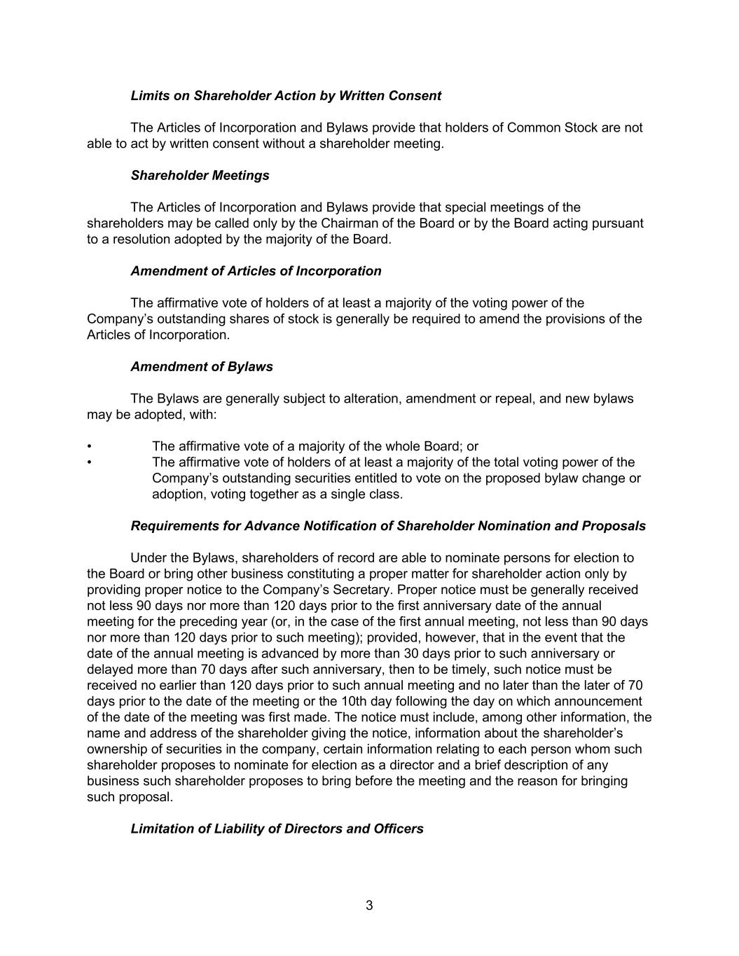3 Limits on Shareholder Action by Written Consent The Articles of Incorporation and Bylaws provide that holders of Common Stock are not able to act by written consent without a shareholder meeting. Shareholder Meetings The Articles of Incorporation and Bylaws provide that special meetings of the shareholders may be called only by the Chairman of the Board or by the Board acting pursuant to a resolution adopted by the majority of the Board. Amendment of Articles of Incorporation The affirmative vote of holders of at least a majority of the voting power of the Company’s outstanding shares of stock is generally be required to amend the provisions of the Articles of Incorporation. Amendment of Bylaws The Bylaws are generally subject to alteration, amendment or repeal, and new bylaws may be adopted, with: • The affirmative vote of a majority of the whole Board; or • The affirmative vote of holders of at least a majority of the total voting power of the Company’s outstanding securities entitled to vote on the proposed bylaw change or adoption, voting together as a single class. Requirements for Advance Notification of Shareholder Nomination and Proposals Under the Bylaws, shareholders of record are able to nominate persons for election to the Board or bring other business constituting a proper matter for shareholder action only by providing proper notice to the Company’s Secretary. Proper notice must be generally received not less 90 days nor more than 120 days prior to the first anniversary date of the annual meeting for the preceding year (or, in the case of the first annual meeting, not less than 90 days nor more than 120 days prior to such meeting); provided, however, that in the event that the date of the annual meeting is advanced by more than 30 days prior to such anniversary or delayed more than 70 days after such anniversary, then to be timely, such notice must be received no earlier than 120 days prior to such annual meeting and no later than the later of 70 days prior to the date of the meeting or the 10th day following the day on which announcement of the date of the meeting was first made. The notice must include, among other information, the name and address of the shareholder giving the notice, information about the shareholder’s ownership of securities in the company, certain information relating to each person whom such shareholder proposes to nominate for election as a director and a brief description of any business such shareholder proposes to bring before the meeting and the reason for bringing such proposal. Limitation of Liability of Directors and Officers