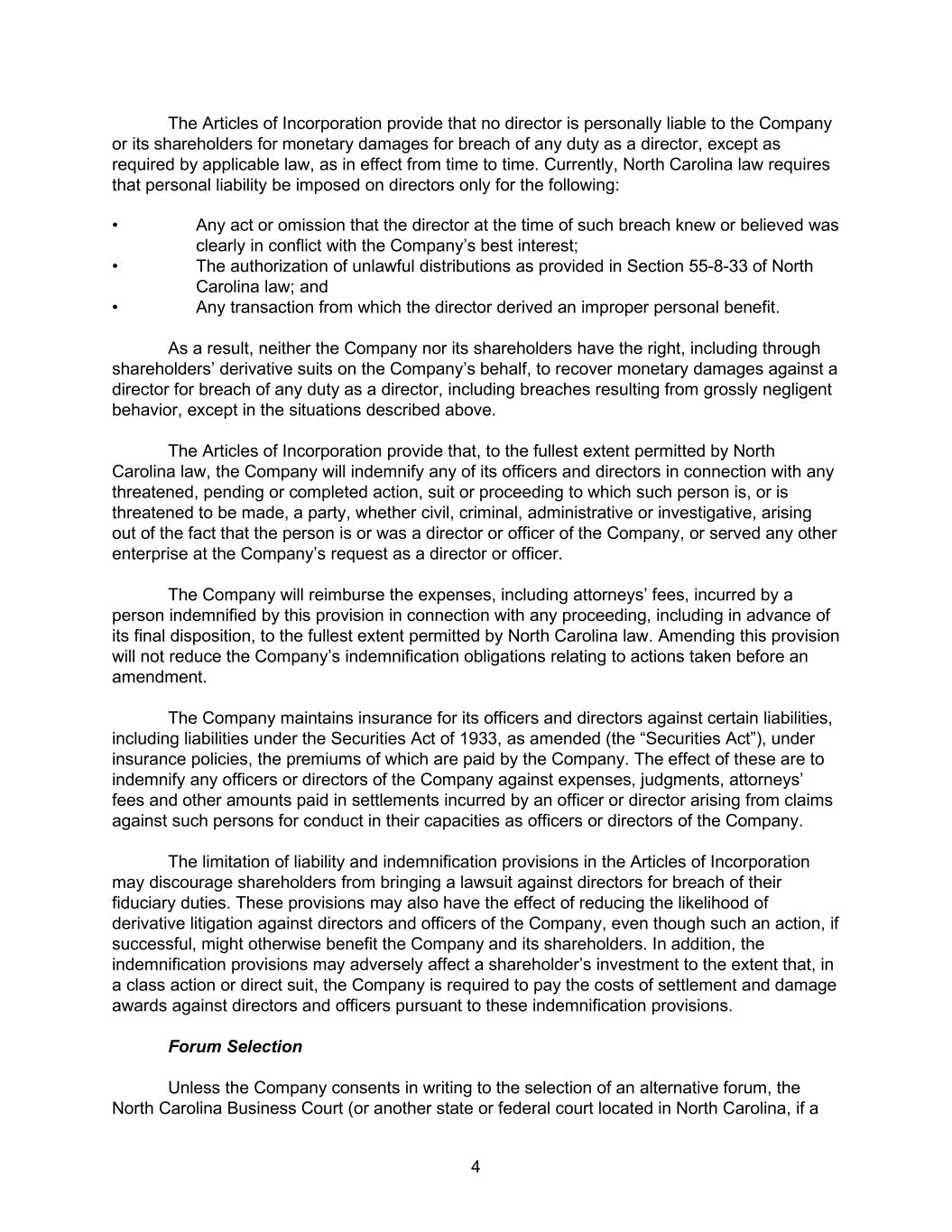 4 The Articles of Incorporation provide that no director is personally liable to the Company or its shareholders for monetary damages for breach of any duty as a director, except as required by applicable law, as in effect from time to time. Currently, North Carolina law requires that personal liability be imposed on directors only for the following: • Any act or omission that the director at the time of such breach knew or believed was clearly in conflict with the Company’s best interest; • The authorization of unlawful distributions as provided in Section 55-8-33 of North Carolina law; and • Any transaction from which the director derived an improper personal benefit. As a result, neither the Company nor its shareholders have the right, including through shareholders’ derivative suits on the Company’s behalf, to recover monetary damages against a director for breach of any duty as a director, including breaches resulting from grossly negligent behavior, except in the situations described above. The Articles of Incorporation provide that, to the fullest extent permitted by North Carolina law, the Company will indemnify any of its officers and directors in connection with any threatened, pending or completed action, suit or proceeding to which such person is, or is threatened to be made, a party, whether civil, criminal, administrative or investigative, arising out of the fact that the person is or was a director or officer of the Company, or served any other enterprise at the Company’s request as a director or officer. The Company will reimburse the expenses, including attorneys’ fees, incurred by a person indemnified by this provision in connection with any proceeding, including in advance of its final disposition, to the fullest extent permitted by North Carolina law. Amending this provision will not reduce the Company’s indemnification obligations relating to actions taken before an amendment. The Company maintains insurance for its officers and directors against certain liabilities, including liabilities under the Securities Act of 1933, as amended (the “Securities Act”), under insurance policies, the premiums of which are paid by the Company. The effect of these are to indemnify any officers or directors of the Company against expenses, judgments, attorneys’ fees and other amounts paid in settlements incurred by an officer or director arising from claims against such persons for conduct in their capacities as officers or directors of the Company. The limitation of liability and indemnification provisions in the Articles of Incorporation may discourage shareholders from bringing a lawsuit against directors for breach of their fiduciary duties. These provisions may also have the effect of reducing the likelihood of derivative litigation against directors and officers of the Company, even though such an action, if successful, might otherwise benefit the Company and its shareholders. In addition, the indemnification provisions may adversely affect a shareholder’s investment to the extent that, in a class action or direct suit, the Company is required to pay the costs of settlement and damage awards against directors and officers pursuant to these indemnification provisions. Forum Selection Unless the Company consents in writing to the selection of an alternative forum, the North Carolina Business Court (or another state or federal court located in North Carolina, if a