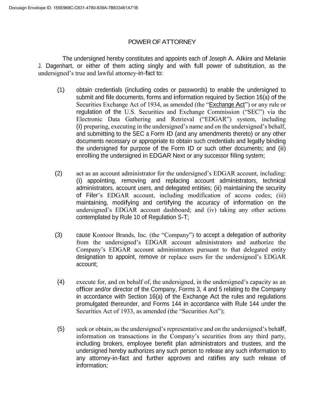 POWER OF ATTORNEY The undersigned hereby constitutes and appoints each of Joseph A. Alkire and Melanie J. Dagenhart, or either of them acting singly and with full power of substitution, as the undersigned’s true and lawful attorney-in-fact to: (1) obtain credentials (including codes or passwords) to enable the undersigned to submit and file documents, forms and information required by Section 16(a) of the Securities Exchange Act of 1934, as amended (the “Exchange Act”) or any rule or regulation of the U.S. Securities and Exchange Commission (“SEC”) via the Electronic Data Gathering and Retrieval (“EDGAR”) system, including (i) preparing, executing in the undersigned’s name and on the undersigned’s behalf, and submitting to the SEC a Form ID (and any amendments thereto) or any other documents necessary or appropriate to obtain such credentials and legally binding the undersigned for purpose of the Form ID or such other documents; and (ii) enrolling the undersigned in EDGAR Next or any successor filing system; (2) act as an account administrator for the undersigned’s EDGAR account, including: (i) appointing, removing and replacing account administrators, technical administrators, account users, and delegated entities; (ii) maintaining the security of Filer’s EDGAR account, including modification of access codes; (iii) maintaining, modifying and certifying the accuracy of information on the undersigned’s EDGAR account dashboard; and (iv) taking any other actions contemplated by Rule 10 of Regulation S-T; (3) cause Kontoor Brands, Inc. (the “Company”) to accept a delegation of authority from the undersigned’s EDGAR account administrators and authorize the Company’s EDGAR account administrators pursuant to that delegated entity designation to appoint, remove or replace users for the undersigned’s EDGAR account; (4) execute for, and on behalf of, the undersigned, in the undersigned’s capacity as an officer and/or director of the Company, Forms 3, 4 and 5 relating to the Company in accordance with Section 16(a) of the Exchange Act the rules and regulations promulgated thereunder, and Forms 144 in accordance with Rule 144 under the Securities Act of 1933, as amended (the “Securities Act”); (5) seek or obtain, as the undersigned’s representative and on the undersigned’s behalf, information on transactions in the Company’s securities from any third party, including brokers, employee benefit plan administrators and trustees, and the undersigned hereby authorizes any such person to release any such information to any attorney-in-fact and further approves and ratifies any such release of information; Docusign Envelope ID: 155E968C-C631-4780-839A-7B633461A71B