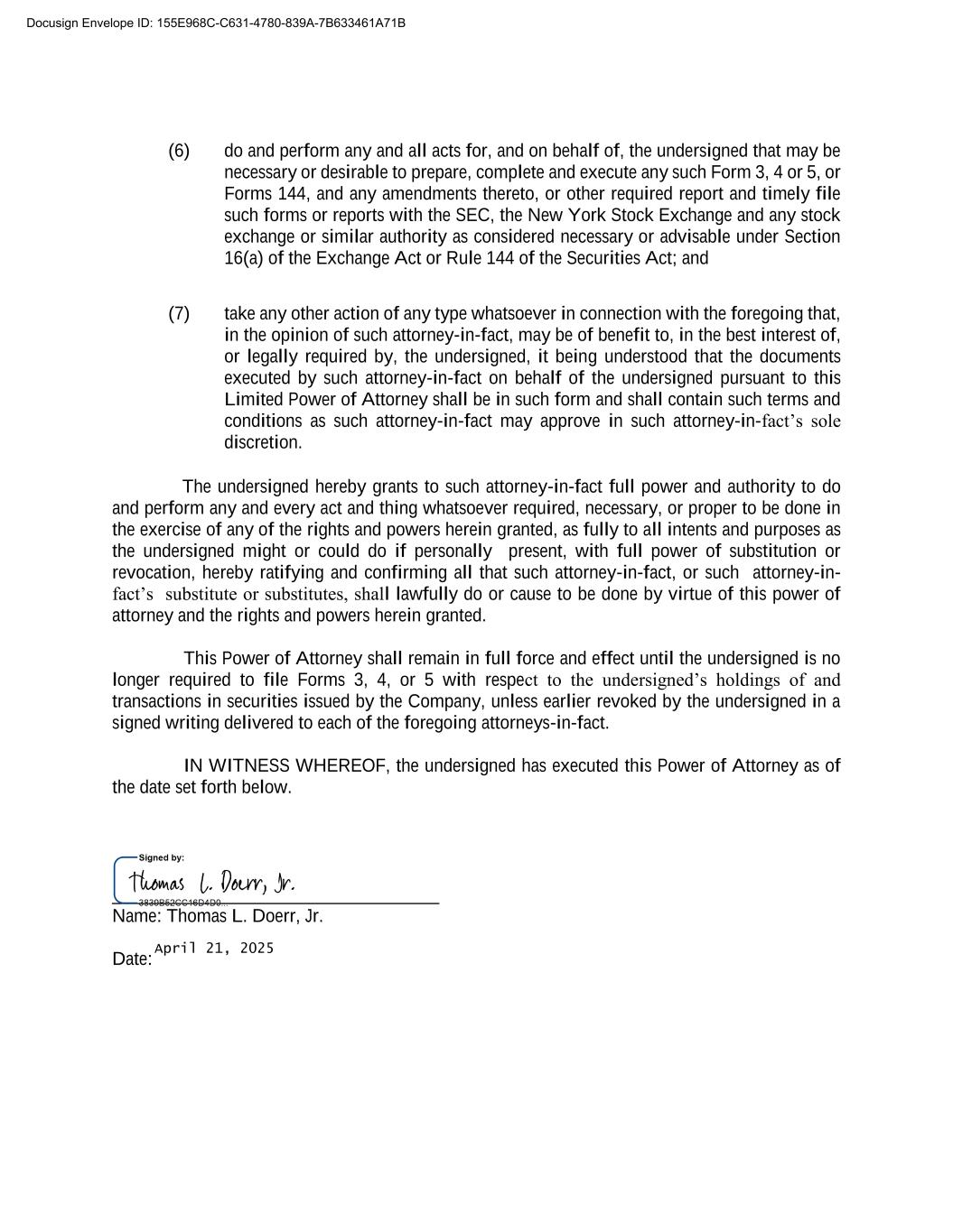 (6) do and perform any and all acts for, and on behalf of, the undersigned that may be necessary or desirable to prepare, complete and execute any such Form 3, 4 or 5, or Forms 144, and any amendments thereto, or other required report and timely file such forms or reports with the SEC, the New York Stock Exchange and any stock exchange or similar authority as considered necessary or advisable under Section 16(a) of the Exchange Act or Rule 144 of the Securities Act; and (7) take any other action of any type whatsoever in connection with the foregoing that, in the opinion of such attorney-in-fact, may be of benefit to, in the best interest of, or legally required by, the undersigned, it being understood that the documents executed by such attorney-in-fact on behalf of the undersigned pursuant to this Limited Power of Attorney shall be in such form and shall contain such terms and conditions as such attorney-in-fact may approve in such attorney-in-fact’s sole discretion. The undersigned hereby grants to such attorney-in-fact full power and authority to do and perform any and every act and thing whatsoever required, necessary, or proper to be done in the exercise of any of the rights and powers herein granted, as fully to all intents and purposes as the undersigned might or could do if personally present, with full power of substitution or revocation, hereby ratifying and confirming all that such attorney-in-fact, or such attorney-in- fact’s substitute or substitutes, shall lawfully do or cause to be done by virtue of this power of attorney and the rights and powers herein granted. This Power of Attorney shall remain in full force and effect until the undersigned is no longer required to file Forms 3, 4, or 5 with respect to the undersigned’s holdings of and transactions in securities issued by the Company, unless earlier revoked by the undersigned in a signed writing delivered to each of the foregoing attorneys-in-fact. IN WITNESS WHEREOF, the undersigned has executed this Power of Attorney as of the date set forth below. ___________________________________ Name: Thomas L. Doerr, Jr. Date: Docusign Envelope ID: 155E968C-C631-4780-839A-7B633461A71B April 21, 2025