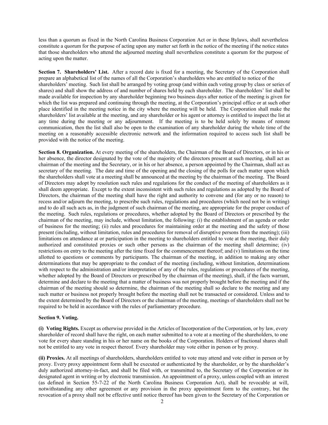 2 less than a quorum as fixed in the North Carolina Business Corporation Act or in these Bylaws, shall nevertheless constitute a quorum for the purpose of acting upon any matter set forth in the notice of the meeting if the notice states that those shareholders who attend the adjourned meeting shall nevertheless constitute a quorum for the purpose of acting upon the matter. Section 7. Shareholders’ List. After a record date is fixed for a meeting, the Secretary of the Corporation shall prepare an alphabetical list of the names of all the Corporation’s shareholders who are entitled to notice of the shareholders’ meeting. Such list shall be arranged by voting group (and within each voting group by class or series of shares) and shall show the address of and number of shares held by each shareholder. The shareholders’ list shall be made available for inspection by any shareholder beginning two business days after notice of the meeting is given for which the list was prepared and continuing through the meeting, at the Corporation’s principal office or at such other place identified in the meeting notice in the city where the meeting will be held. The Corporation shall make the shareholders’ list available at the meeting, and any shareholder or his agent or attorney is entitled to inspect the list at any time during the meeting or any adjournment. If the meeting is to be held solely by means of remote communication, then the list shall also be open to the examination of any shareholder during the whole time of the meeting on a reasonably accessible electronic network and the information required to access such list shall be provided with the notice of the meeting. Section 8. Organization. At every meeting of the shareholders, the Chairman of the Board of Directors, or in his or her absence, the director designated by the vote of the majority of the directors present at such meeting, shall act as chairman of the meeting and the Secretary, or in his or her absence, a person appointed by the Chairman, shall act as secretary of the meeting. The date and time of the opening and the closing of the polls for each matter upon which the shareholders shall vote at a meeting shall be announced at the meeting by the chairman of the meeting. The Board of Directors may adopt by resolution such rules and regulations for the conduct of the meeting of shareholders as it shall deem appropriate. Except to the extent inconsistent with such rules and regulations as adopted by the Board of Directors, the chairman of the meeting shall have the right and authority to convene and (for any or no reason) to recess and/or adjourn the meeting, to prescribe such rules, regulations and procedures (which need not be in writing) and to do all such acts as, in the judgment of such chairman of the meeting, are appropriate for the proper conduct of the meeting. Such rules, regulations or procedures, whether adopted by the Board of Directors or prescribed by the chairman of the meeting, may include, without limitation, the following: (i) the establishment of an agenda or order of business for the meeting; (ii) rules and procedures for maintaining order at the meeting and the safety of those present (including, without limitation, rules and procedures for removal of disruptive persons from the meeting); (iii) limitations on attendance at or participation in the meeting to shareholders entitled to vote at the meeting, their duly authorized and constituted proxies or such other persons as the chairman of the meeting shall determine; (iv) restrictions on entry to the meeting after the time fixed for the commencement thereof; and (v) limitations on the time allotted to questions or comments by participants. The chairman of the meeting, in addition to making any other determinations that may be appropriate to the conduct of the meeting (including, without limitation, determinations with respect to the administration and/or interpretation of any of the rules, regulations or procedures of the meeting, whether adopted by the Board of Directors or prescribed by the chairman of the meeting), shall, if the facts warrant, determine and declare to the meeting that a matter of business was not properly brought before the meeting and if the chairman of the meeting should so determine, the chairman of the meeting shall so declare to the meeting and any such matter or business not properly brought before the meeting shall not be transacted or considered. Unless and to the extent determined by the Board of Directors or the chairman of the meeting, meetings of shareholders shall not be required to be held in accordance with the rules of parliamentary procedure. Section 9. Voting. (i) Voting Rights. Except as otherwise provided in the Articles of Incorporation of the Corporation, or by law, every shareholder of record shall have the right, on each matter submitted to a vote at a meeting of the shareholders, to one vote for every share standing in his or her name on the books of the Corporation. Holders of fractional shares shall not be entitled to any vote in respect thereof. Every shareholder may vote either in person or by proxy. (ii) Proxies. At all meetings of shareholders, shareholders entitled to vote may attend and vote either in person or by proxy. Every proxy appointment form shall be executed or authenticated by the shareholder, or by the shareholder’s duly authorized attorney-in-fact, and shall be filed with, or transmitted to, the Secretary of the Corporation or its designated agent in writing or by electronic transmission. An appointment of a proxy, unless coupled with an interest (as defined in Section 55-7-22 of the North Carolina Business Corporation Act), shall be revocable at will, notwithstanding any other agreement or any provision in the proxy appointment form to the contrary, but the revocation of a proxy shall not be effective until notice thereof has been given to the Secretary of the Corporation or