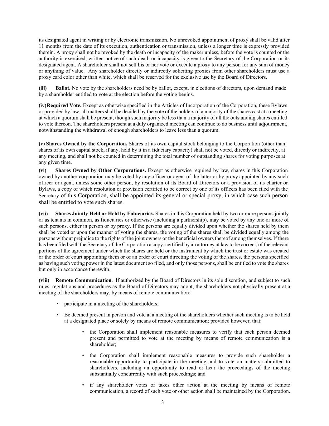 3 its designated agent in writing or by electronic transmission. No unrevoked appointment of proxy shall be valid after 11 months from the date of its execution, authentication or transmission, unless a longer time is expressly provided therein. A proxy shall not be revoked by the death or incapacity of the maker unless, before the vote is counted or the authority is exercised, written notice of such death or incapacity is given to the Secretary of the Corporation or its designated agent. A shareholder shall not sell his or her vote or execute a proxy to any person for any sum of money or anything of value. Any shareholder directly or indirectly soliciting proxies from other shareholders must use a proxy card color other than white, which shall be reserved for the exclusive use by the Board of Directors. (iii) Ballot. No vote by the shareholders need be by ballot, except, in elections of directors, upon demand made by a shareholder entitled to vote at the election before the voting begins. (iv) Required Vote. Except as otherwise specified in the Articles of Incorporation of the Corporation, these Bylaws or provided by law, all matters shall be decided by the vote of the holders of a majority of the shares cast at a meeting at which a quorum shall be present, though such majority be less than a majority of all the outstanding shares entitled to vote thereon. The shareholders present at a duly organized meeting can continue to do business until adjournment, notwithstanding the withdrawal of enough shareholders to leave less than a quorum. (v) Shares Owned by the Corporation. Shares of its own capital stock belonging to the Corporation (other than shares of its own capital stock, if any, held by it in a fiduciary capacity) shall not be voted, directly or indirectly, at any meeting, and shall not be counted in determining the total number of outstanding shares for voting purposes at any given time. (vi) Shares Owned by Other Corporations. Except as otherwise required by law, shares in this Corporation owned by another corporation may be voted by any officer or agent of the latter or by proxy appointed by any such officer or agent, unless some other person, by resolution of its Board of Directors or a provision of its charter or Bylaws, a copy of which resolution or provision certified to be correct by one of its officers has been filed with the Secretary of this Corporation, shall be appointed its general or special proxy, in which case such person shall be entitled to vote such shares. (vii) Shares Jointly Held or Held by Fiduciaries. Shares in this Corporation held by two or more persons jointly or as tenants in common, as fiduciaries or otherwise (including a partnership), may be voted by any one or more of such persons, either in person or by proxy. If the persons are equally divided upon whether the shares held by them shall be voted or upon the manner of voting the shares, the voting of the shares shall be divided equally among the persons without prejudice to the rights of the joint owners or the beneficial owners thereof among themselves. If there has been filed with the Secretary of the Corporation a copy, certified by an attorney at law to be correct, of the relevant portions of the agreement under which the shares are held or the instrument by which the trust or estate was created or the order of court appointing them or of an order of court directing the voting of the shares, the persons specified as having such voting power in the latest document so filed, and only those persons, shall be entitled to vote the shares but only in accordance therewith. (viii) Remote Communication. If authorized by the Board of Directors in its sole discretion, and subject to such rules, regulations and procedures as the Board of Directors may adopt, the shareholders not physically present at a meeting of the shareholders may, by means of remote communication: • participate in a meeting of the shareholders; • Be deemed present in person and vote at a meeting of the shareholders whether such meeting is to be held at a designated place or solely by means of remote communication; provided however, that: • the Corporation shall implement reasonable measures to verify that each person deemed present and permitted to vote at the meeting by means of remote communication is a shareholder; • the Corporation shall implement reasonable measures to provide such shareholder a reasonable opportunity to participate in the meeting and to vote on matters submitted to shareholders, including an opportunity to read or hear the proceedings of the meeting substantially concurrently with such proceedings; and • if any shareholder votes or takes other action at the meeting by means of remote communication, a record of such vote or other action shall be maintained by the Corporation.