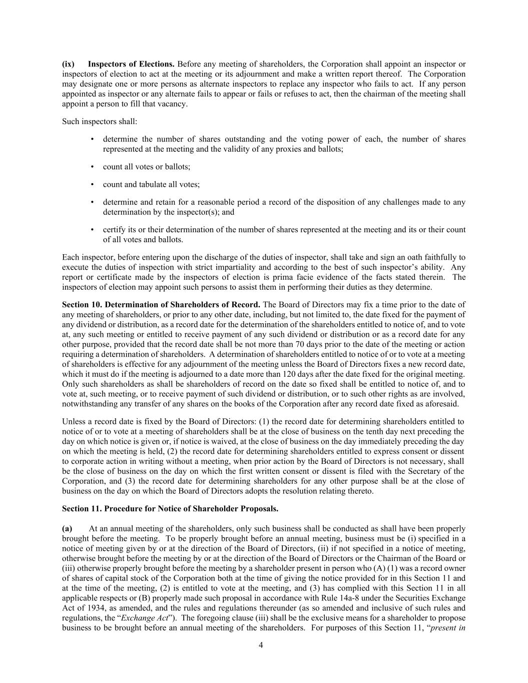 4 (ix) Inspectors of Elections. Before any meeting of shareholders, the Corporation shall appoint an inspector or inspectors of election to act at the meeting or its adjournment and make a written report thereof. The Corporation may designate one or more persons as alternate inspectors to replace any inspector who fails to act. If any person appointed as inspector or any alternate fails to appear or fails or refuses to act, then the chairman of the meeting shall appoint a person to fill that vacancy. Such inspectors shall: • determine the number of shares outstanding and the voting power of each, the number of shares represented at the meeting and the validity of any proxies and ballots; • count all votes or ballots; • count and tabulate all votes; • determine and retain for a reasonable period a record of the disposition of any challenges made to any determination by the inspector(s); and • certify its or their determination of the number of shares represented at the meeting and its or their count of all votes and ballots. Each inspector, before entering upon the discharge of the duties of inspector, shall take and sign an oath faithfully to execute the duties of inspection with strict impartiality and according to the best of such inspector’s ability. Any report or certificate made by the inspectors of election is prima facie evidence of the facts stated therein. The inspectors of election may appoint such persons to assist them in performing their duties as they determine. Section 10. Determination of Shareholders of Record. The Board of Directors may fix a time prior to the date of any meeting of shareholders, or prior to any other date, including, but not limited to, the date fixed for the payment of any dividend or distribution, as a record date for the determination of the shareholders entitled to notice of, and to vote at, any such meeting or entitled to receive payment of any such dividend or distribution or as a record date for any other purpose, provided that the record date shall be not more than 70 days prior to the date of the meeting or action requiring a determination of shareholders. A determination of shareholders entitled to notice of or to vote at a meeting of shareholders is effective for any adjournment of the meeting unless the Board of Directors fixes a new record date, which it must do if the meeting is adjourned to a date more than 120 days after the date fixed for the original meeting. Only such shareholders as shall be shareholders of record on the date so fixed shall be entitled to notice of, and to vote at, such meeting, or to receive payment of such dividend or distribution, or to such other rights as are involved, notwithstanding any transfer of any shares on the books of the Corporation after any record date fixed as aforesaid. Unless a record date is fixed by the Board of Directors: (1) the record date for determining shareholders entitled to notice of or to vote at a meeting of shareholders shall be at the close of business on the tenth day next preceding the day on which notice is given or, if notice is waived, at the close of business on the day immediately preceding the day on which the meeting is held, (2) the record date for determining shareholders entitled to express consent or dissent to corporate action in writing without a meeting, when prior action by the Board of Directors is not necessary, shall be the close of business on the day on which the first written consent or dissent is filed with the Secretary of the Corporation, and (3) the record date for determining shareholders for any other purpose shall be at the close of business on the day on which the Board of Directors adopts the resolution relating thereto. Section 11. Procedure for Notice of Shareholder Proposals. (a) At an annual meeting of the shareholders, only such business shall be conducted as shall have been properly brought before the meeting. To be properly brought before an annual meeting, business must be (i) specified in a notice of meeting given by or at the direction of the Board of Directors, (ii) if not specified in a notice of meeting, otherwise brought before the meeting by or at the direction of the Board of Directors or the Chairman of the Board or (iii) otherwise properly brought before the meeting by a shareholder present in person who (A) (1) was a record owner of shares of capital stock of the Corporation both at the time of giving the notice provided for in this Section 11 and at the time of the meeting, (2) is entitled to vote at the meeting, and (3) has complied with this Section 11 in all applicable respects or (B) properly made such proposal in accordance with Rule 14a-8 under the Securities Exchange Act of 1934, as amended, and the rules and regulations thereunder (as so amended and inclusive of such rules and regulations, the “Exchange Act”). The foregoing clause (iii) shall be the exclusive means for a shareholder to propose business to be brought before an annual meeting of the shareholders. For purposes of this Section 11, “present in