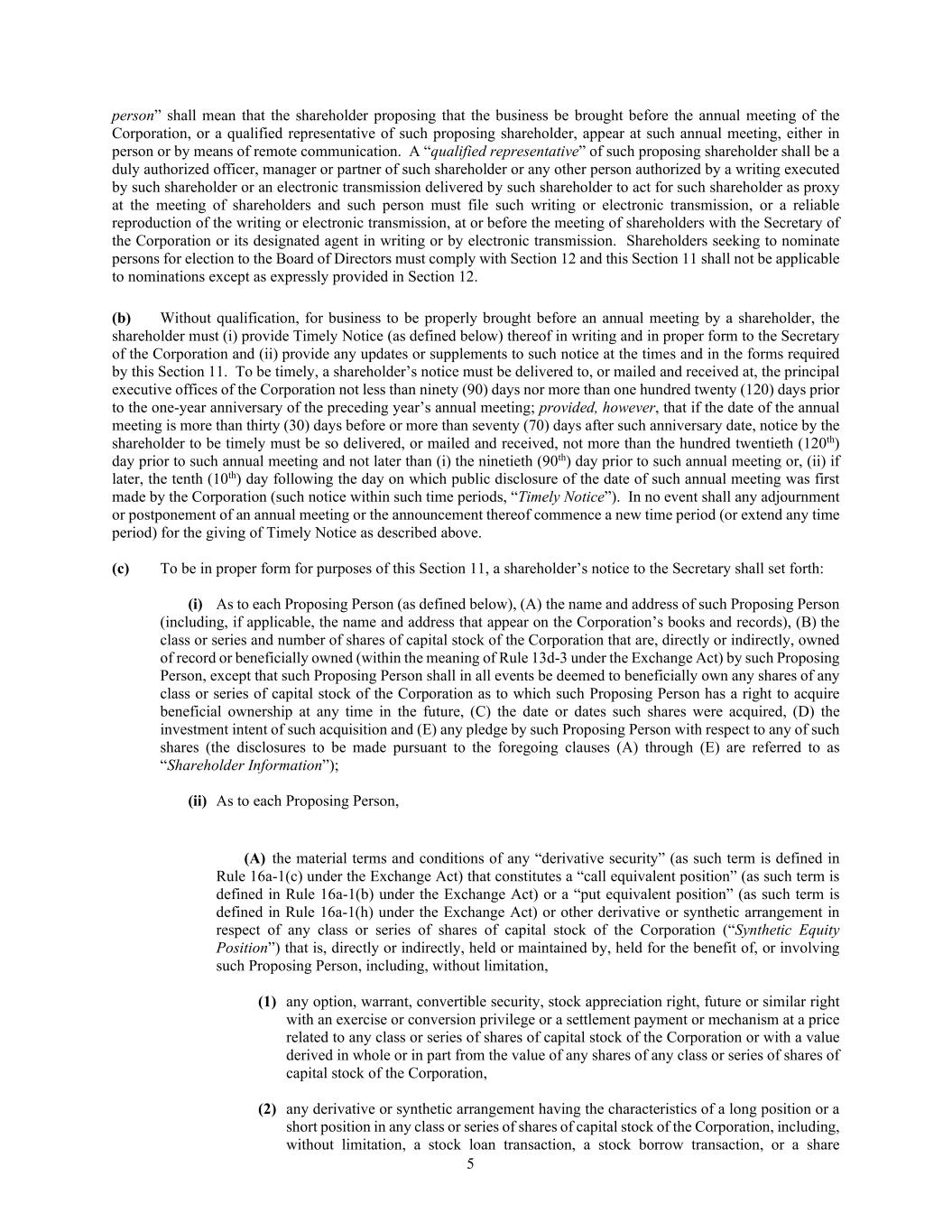 5 person” shall mean that the shareholder proposing that the business be brought before the annual meeting of the Corporation, or a qualified representative of such proposing shareholder, appear at such annual meeting, either in person or by means of remote communication. A “qualified representative” of such proposing shareholder shall be a duly authorized officer, manager or partner of such shareholder or any other person authorized by a writing executed by such shareholder or an electronic transmission delivered by such shareholder to act for such shareholder as proxy at the meeting of shareholders and such person must file such writing or electronic transmission, or a reliable reproduction of the writing or electronic transmission, at or before the meeting of shareholders with the Secretary of the Corporation or its designated agent in writing or by electronic transmission. Shareholders seeking to nominate persons for election to the Board of Directors must comply with Section 12 and this Section 11 shall not be applicable to nominations except as expressly provided in Section 12. (b) Without qualification, for business to be properly brought before an annual meeting by a shareholder, the shareholder must (i) provide Timely Notice (as defined below) thereof in writing and in proper form to the Secretary of the Corporation and (ii) provide any updates or supplements to such notice at the times and in the forms required by this Section 11. To be timely, a shareholder’s notice must be delivered to, or mailed and received at, the principal executive offices of the Corporation not less than ninety (90) days nor more than one hundred twenty (120) days prior to the one-year anniversary of the preceding year’s annual meeting; provided, however, that if the date of the annual meeting is more than thirty (30) days before or more than seventy (70) days after such anniversary date, notice by the shareholder to be timely must be so delivered, or mailed and received, not more than the hundred twentieth (120th) day prior to such annual meeting and not later than (i) the ninetieth (90th) day prior to such annual meeting or, (ii) if later, the tenth (10th) day following the day on which public disclosure of the date of such annual meeting was first made by the Corporation (such notice within such time periods, “Timely Notice”). In no event shall any adjournment or postponement of an annual meeting or the announcement thereof commence a new time period (or extend any time period) for the giving of Timely Notice as described above. (c) To be in proper form for purposes of this Section 11, a shareholder’s notice to the Secretary shall set forth: (i) As to each Proposing Person (as defined below), (A) the name and address of such Proposing Person (including, if applicable, the name and address that appear on the Corporation’s books and records), (B) the class or series and number of shares of capital stock of the Corporation that are, directly or indirectly, owned of record or beneficially owned (within the meaning of Rule 13d-3 under the Exchange Act) by such Proposing Person, except that such Proposing Person shall in all events be deemed to beneficially own any shares of any class or series of capital stock of the Corporation as to which such Proposing Person has a right to acquire beneficial ownership at any time in the future, (C) the date or dates such shares were acquired, (D) the investment intent of such acquisition and (E) any pledge by such Proposing Person with respect to any of such shares (the disclosures to be made pursuant to the foregoing clauses (A) through (E) are referred to as “Shareholder Information”); (ii) As to each Proposing Person, (A) the material terms and conditions of any “derivative security” (as such term is defined in Rule 16a-1(c) under the Exchange Act) that constitutes a “call equivalent position” (as such term is defined in Rule 16a-1(b) under the Exchange Act) or a “put equivalent position” (as such term is defined in Rule 16a-1(h) under the Exchange Act) or other derivative or synthetic arrangement in respect of any class or series of shares of capital stock of the Corporation (“Synthetic Equity Position”) that is, directly or indirectly, held or maintained by, held for the benefit of, or involving such Proposing Person, including, without limitation, (1) any option, warrant, convertible security, stock appreciation right, future or similar right with an exercise or conversion privilege or a settlement payment or mechanism at a price related to any class or series of shares of capital stock of the Corporation or with a value derived in whole or in part from the value of any shares of any class or series of shares of capital stock of the Corporation, (2) any derivative or synthetic arrangement having the characteristics of a long position or a short position in any class or series of shares of capital stock of the Corporation, including, without limitation, a stock loan transaction, a stock borrow transaction, or a share