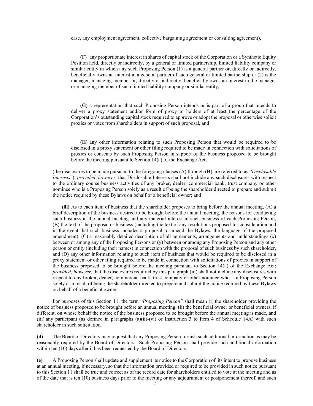 7 case, any employment agreement, collective bargaining agreement or consulting agreement), (F) any proportionate interest in shares of capital stock of the Corporation or a Synthetic Equity Position held, directly or indirectly, by a general or limited partnership, limited liability company or similar entity in which any such Proposing Person (1) is a general partner or, directly or indirectly, beneficially owns an interest in a general partner of such general or limited partnership or (2) is the manager, managing member or, directly or indirectly, beneficially owns an interest in the manager or managing member of such limited liability company or similar entity, (G) a representation that such Proposing Person intends or is part of a group that intends to deliver a proxy statement and/or form of proxy to holders of at least the percentage of the Corporation’s outstanding capital stock required to approve or adopt the proposal or otherwise solicit proxies or votes from shareholders in support of such proposal, and (H) any other information relating to such Proposing Person that would be required to be disclosed in a proxy statement or other filing required to be made in connection with solicitations of proxies or consents by such Proposing Person in support of the business proposed to be brought before the meeting pursuant to Section 14(a) of the Exchange Act, (the disclosures to be made pursuant to the foregoing clauses (A) through (H) are referred to as “Disclosable Interests”); provided, however, that Disclosable Interests shall not include any such disclosures with respect to the ordinary course business activities of any broker, dealer, commercial bank, trust company or other nominee who is a Proposing Person solely as a result of being the shareholder directed to prepare and submit the notice required by these Bylaws on behalf of a beneficial owner; and (iii) As to each item of business that the shareholder proposes to bring before the annual meeting, (A) a brief description of the business desired to be brought before the annual meeting, the reasons for conducting such business at the annual meeting and any material interest in such business of each Proposing Person, (B) the text of the proposal or business (including the text of any resolutions proposed for consideration and in the event that such business includes a proposal to amend the Bylaws, the language of the proposed amendment), (C) a reasonably detailed description of all agreements, arrangements and understandings (x) between or among any of the Proposing Persons or (y) between or among any Proposing Person and any other person or entity (including their names) in connection with the proposal of such business by such shareholder, and (D) any other information relating to such item of business that would be required to be disclosed in a proxy statement or other filing required to be made in connection with solicitations of proxies in support of the business proposed to be brought before the meeting pursuant to Section 14(a) of the Exchange Act; provided, however, that the disclosures required by this paragraph (iii) shall not include any disclosures with respect to any broker, dealer, commercial bank, trust company or other nominee who is a Proposing Person solely as a result of being the shareholder directed to prepare and submit the notice required by these Bylaws on behalf of a beneficial owner. For purposes of this Section 11, the term “Proposing Person” shall mean (i) the shareholder providing the notice of business proposed to be brought before an annual meeting, (ii) the beneficial owner or beneficial owners, if different, on whose behalf the notice of the business proposed to be brought before the annual meeting is made, and (iii) any participant (as defined in paragraphs (a)(ii)-(vi) of Instruction 3 to Item 4 of Schedule 14A) with such shareholder in such solicitation. (d) The Board of Directors may request that any Proposing Person furnish such additional information as may be reasonably required by the Board of Directors. Such Proposing Person shall provide such additional information within ten (10) days after it has been requested by the Board of Directors. (e) A Proposing Person shall update and supplement its notice to the Corporation of its intent to propose business at an annual meeting, if necessary, so that the information provided or required to be provided in such notice pursuant to this Section 11 shall be true and correct as of the record date for shareholders entitled to vote at the meeting and as of the date that is ten (10) business days prior to the meeting or any adjournment or postponement thereof, and such