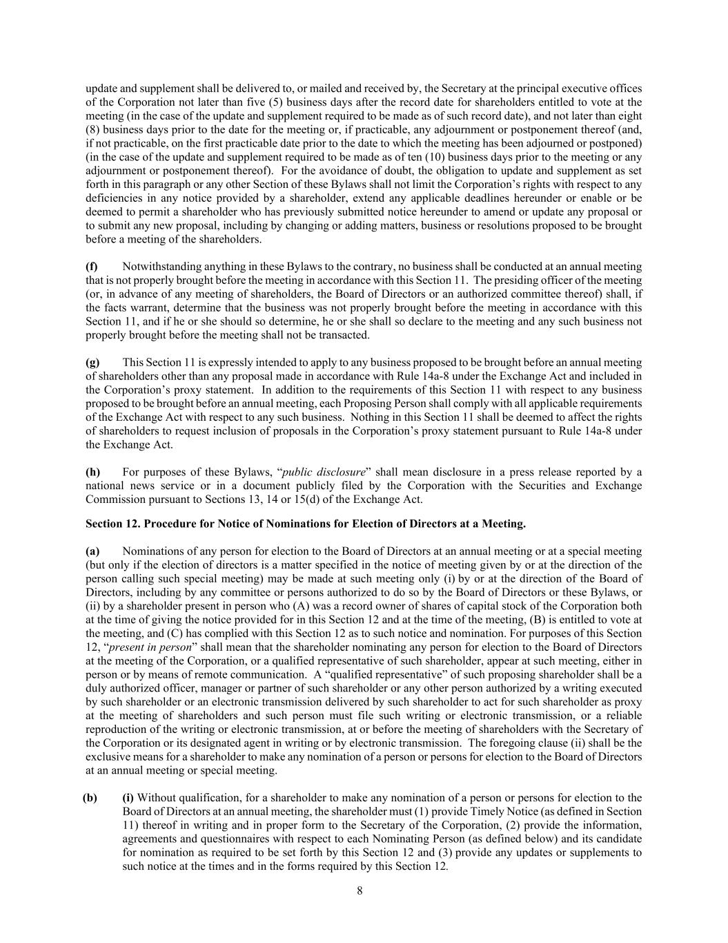 8 update and supplement shall be delivered to, or mailed and received by, the Secretary at the principal executive offices of the Corporation not later than five (5) business days after the record date for shareholders entitled to vote at the meeting (in the case of the update and supplement required to be made as of such record date), and not later than eight (8) business days prior to the date for the meeting or, if practicable, any adjournment or postponement thereof (and, if not practicable, on the first practicable date prior to the date to which the meeting has been adjourned or postponed) (in the case of the update and supplement required to be made as of ten (10) business days prior to the meeting or any adjournment or postponement thereof). For the avoidance of doubt, the obligation to update and supplement as set forth in this paragraph or any other Section of these Bylaws shall not limit the Corporation’s rights with respect to any deficiencies in any notice provided by a shareholder, extend any applicable deadlines hereunder or enable or be deemed to permit a shareholder who has previously submitted notice hereunder to amend or update any proposal or to submit any new proposal, including by changing or adding matters, business or resolutions proposed to be brought before a meeting of the shareholders. (f) Notwithstanding anything in these Bylaws to the contrary, no business shall be conducted at an annual meeting that is not properly brought before the meeting in accordance with this Section 11. The presiding officer of the meeting (or, in advance of any meeting of shareholders, the Board of Directors or an authorized committee thereof) shall, if the facts warrant, determine that the business was not properly brought before the meeting in accordance with this Section 11, and if he or she should so determine, he or she shall so declare to the meeting and any such business not properly brought before the meeting shall not be transacted. (g) This Section 11 is expressly intended to apply to any business proposed to be brought before an annual meeting of shareholders other than any proposal made in accordance with Rule 14a-8 under the Exchange Act and included in the Corporation’s proxy statement. In addition to the requirements of this Section 11 with respect to any business proposed to be brought before an annual meeting, each Proposing Person shall comply with all applicable requirements of the Exchange Act with respect to any such business. Nothing in this Section 11 shall be deemed to affect the rights of shareholders to request inclusion of proposals in the Corporation’s proxy statement pursuant to Rule 14a-8 under the Exchange Act. (h) For purposes of these Bylaws, “public disclosure” shall mean disclosure in a press release reported by a national news service or in a document publicly filed by the Corporation with the Securities and Exchange Commission pursuant to Sections 13, 14 or 15(d) of the Exchange Act. Section 12. Procedure for Notice of Nominations for Election of Directors at a Meeting. (a) Nominations of any person for election to the Board of Directors at an annual meeting or at a special meeting (but only if the election of directors is a matter specified in the notice of meeting given by or at the direction of the person calling such special meeting) may be made at such meeting only (i) by or at the direction of the Board of Directors, including by any committee or persons authorized to do so by the Board of Directors or these Bylaws, or (ii) by a shareholder present in person who (A) was a record owner of shares of capital stock of the Corporation both at the time of giving the notice provided for in this Section 12 and at the time of the meeting, (B) is entitled to vote at the meeting, and (C) has complied with this Section 12 as to such notice and nomination. For purposes of this Section 12, “present in person” shall mean that the shareholder nominating any person for election to the Board of Directors at the meeting of the Corporation, or a qualified representative of such shareholder, appear at such meeting, either in person or by means of remote communication. A “qualified representative” of such proposing shareholder shall be a duly authorized officer, manager or partner of such shareholder or any other person authorized by a writing executed by such shareholder or an electronic transmission delivered by such shareholder to act for such shareholder as proxy at the meeting of shareholders and such person must file such writing or electronic transmission, or a reliable reproduction of the writing or electronic transmission, at or before the meeting of shareholders with the Secretary of the Corporation or its designated agent in writing or by electronic transmission. The foregoing clause (ii) shall be the exclusive means for a shareholder to make any nomination of a person or persons for election to the Board of Directors at an annual meeting or special meeting. (b) (i) Without qualification, for a shareholder to make any nomination of a person or persons for election to the Board of Directors at an annual meeting, the shareholder must (1) provide Timely Notice (as defined in Section 11) thereof in writing and in proper form to the Secretary of the Corporation, (2) provide the information, agreements and questionnaires with respect to each Nominating Person (as defined below) and its candidate for nomination as required to be set forth by this Section 12 and (3) provide any updates or supplements to such notice at the times and in the forms required by this Section 12.