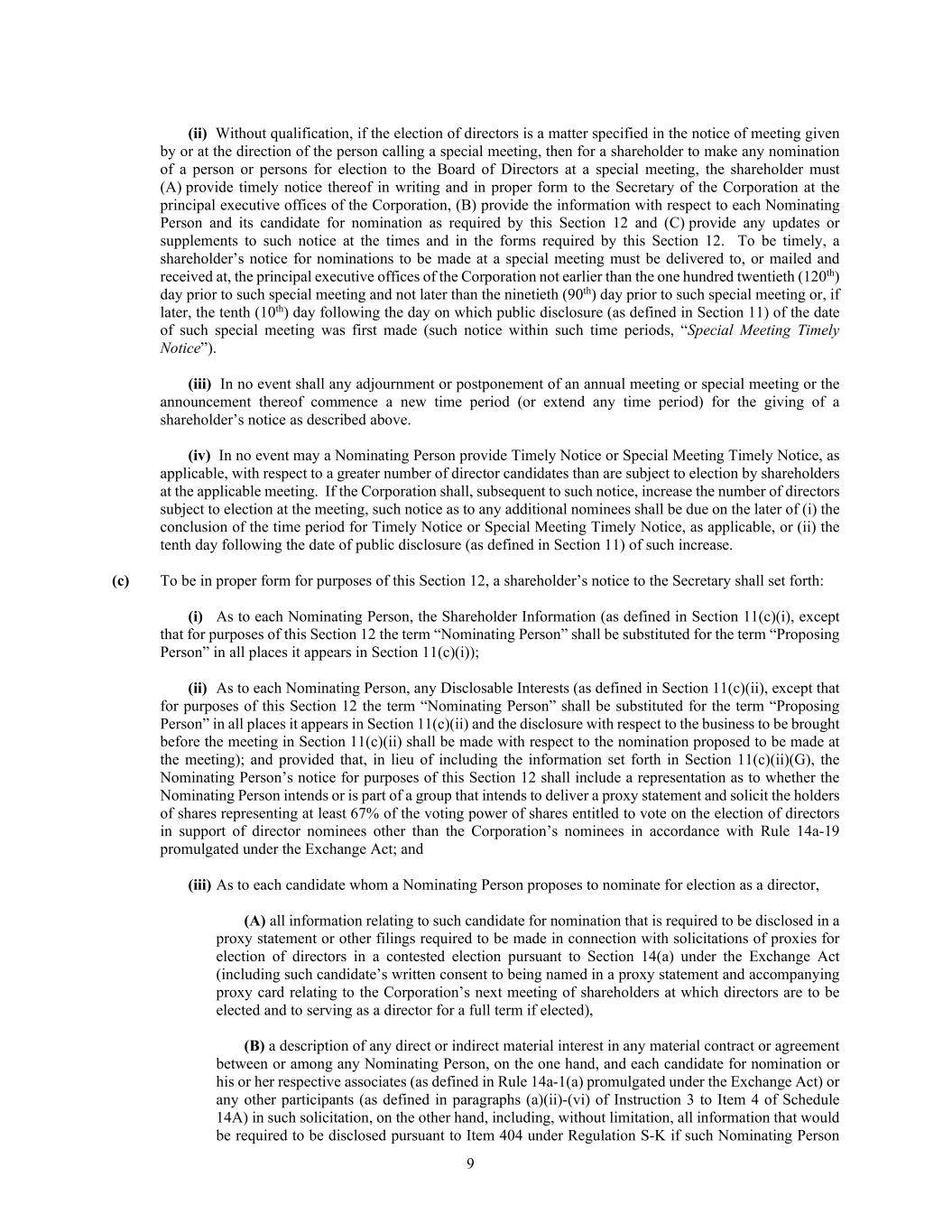 9 (ii) Without qualification, if the election of directors is a matter specified in the notice of meeting given by or at the direction of the person calling a special meeting, then for a shareholder to make any nomination of a person or persons for election to the Board of Directors at a special meeting, the shareholder must (A) provide timely notice thereof in writing and in proper form to the Secretary of the Corporation at the principal executive offices of the Corporation, (B) provide the information with respect to each Nominating Person and its candidate for nomination as required by this Section 12 and (C) provide any updates or supplements to such notice at the times and in the forms required by this Section 12. To be timely, a shareholder’s notice for nominations to be made at a special meeting must be delivered to, or mailed and received at, the principal executive offices of the Corporation not earlier than the one hundred twentieth (120th) day prior to such special meeting and not later than the ninetieth (90th) day prior to such special meeting or, if later, the tenth (10th) day following the day on which public disclosure (as defined in Section 11) of the date of such special meeting was first made (such notice within such time periods, “Special Meeting Timely Notice”). (iii) In no event shall any adjournment or postponement of an annual meeting or special meeting or the announcement thereof commence a new time period (or extend any time period) for the giving of a shareholder’s notice as described above. (iv) In no event may a Nominating Person provide Timely Notice or Special Meeting Timely Notice, as applicable, with respect to a greater number of director candidates than are subject to election by shareholders at the applicable meeting. If the Corporation shall, subsequent to such notice, increase the number of directors subject to election at the meeting, such notice as to any additional nominees shall be due on the later of (i) the conclusion of the time period for Timely Notice or Special Meeting Timely Notice, as applicable, or (ii) the tenth day following the date of public disclosure (as defined in Section 11) of such increase. (c) To be in proper form for purposes of this Section 12, a shareholder’s notice to the Secretary shall set forth: (i) As to each Nominating Person, the Shareholder Information (as defined in Section 11(c)(i), except that for purposes of this Section 12 the term “Nominating Person” shall be substituted for the term “Proposing Person” in all places it appears in Section 11(c)(i)); (ii) As to each Nominating Person, any Disclosable Interests (as defined in Section 11(c)(ii), except that for purposes of this Section 12 the term “Nominating Person” shall be substituted for the term “Proposing Person” in all places it appears in Section 11(c)(ii) and the disclosure with respect to the business to be brought before the meeting in Section 11(c)(ii) shall be made with respect to the nomination proposed to be made at the meeting); and provided that, in lieu of including the information set forth in Section 11(c)(ii)(G), the Nominating Person’s notice for purposes of this Section 12 shall include a representation as to whether the Nominating Person intends or is part of a group that intends to deliver a proxy statement and solicit the holders of shares representing at least 67% of the voting power of shares entitled to vote on the election of directors in support of director nominees other than the Corporation’s nominees in accordance with Rule 14a-19 promulgated under the Exchange Act; and (iii) As to each candidate whom a Nominating Person proposes to nominate for election as a director, (A) all information relating to such candidate for nomination that is required to be disclosed in a proxy statement or other filings required to be made in connection with solicitations of proxies for election of directors in a contested election pursuant to Section 14(a) under the Exchange Act (including such candidate’s written consent to being named in a proxy statement and accompanying proxy card relating to the Corporation’s next meeting of shareholders at which directors are to be elected and to serving as a director for a full term if elected), (B) a description of any direct or indirect material interest in any material contract or agreement between or among any Nominating Person, on the one hand, and each candidate for nomination or his or her respective associates (as defined in Rule 14a-1(a) promulgated under the Exchange Act) or any other participants (as defined in paragraphs (a)(ii)-(vi) of Instruction 3 to Item 4 of Schedule 14A) in such solicitation, on the other hand, including, without limitation, all information that would be required to be disclosed pursuant to Item 404 under Regulation S-K if such Nominating Person