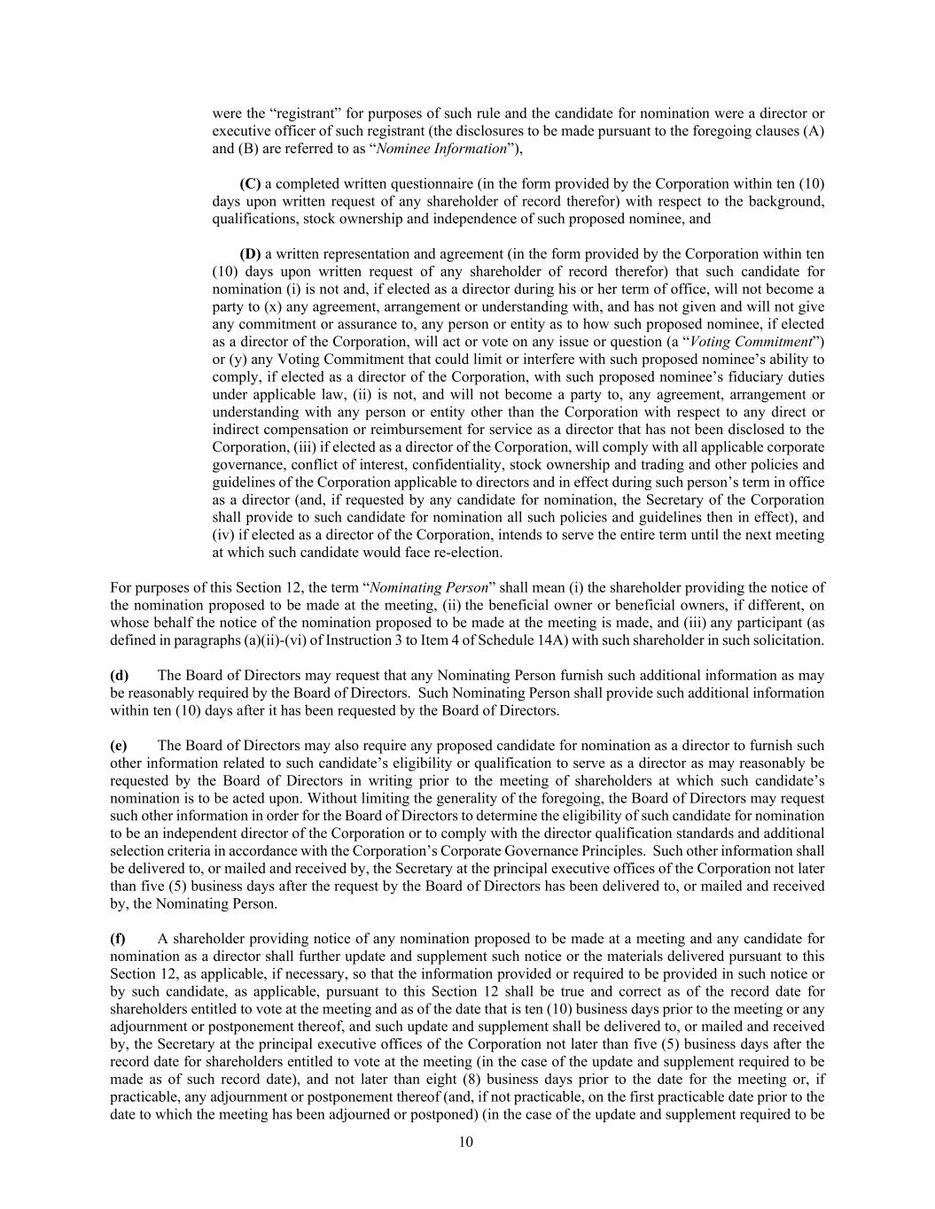 10 were the “registrant” for purposes of such rule and the candidate for nomination were a director or executive officer of such registrant (the disclosures to be made pursuant to the foregoing clauses (A) and (B) are referred to as “Nominee Information”), (C) a completed written questionnaire (in the form provided by the Corporation within ten (10) days upon written request of any shareholder of record therefor) with respect to the background, qualifications, stock ownership and independence of such proposed nominee, and (D) a written representation and agreement (in the form provided by the Corporation within ten (10) days upon written request of any shareholder of record therefor) that such candidate for nomination (i) is not and, if elected as a director during his or her term of office, will not become a party to (x) any agreement, arrangement or understanding with, and has not given and will not give any commitment or assurance to, any person or entity as to how such proposed nominee, if elected as a director of the Corporation, will act or vote on any issue or question (a “Voting Commitment”) or (y) any Voting Commitment that could limit or interfere with such proposed nominee’s ability to comply, if elected as a director of the Corporation, with such proposed nominee’s fiduciary duties under applicable law, (ii) is not, and will not become a party to, any agreement, arrangement or understanding with any person or entity other than the Corporation with respect to any direct or indirect compensation or reimbursement for service as a director that has not been disclosed to the Corporation, (iii) if elected as a director of the Corporation, will comply with all applicable corporate governance, conflict of interest, confidentiality, stock ownership and trading and other policies and guidelines of the Corporation applicable to directors and in effect during such person’s term in office as a director (and, if requested by any candidate for nomination, the Secretary of the Corporation shall provide to such candidate for nomination all such policies and guidelines then in effect), and (iv) if elected as a director of the Corporation, intends to serve the entire term until the next meeting at which such candidate would face re-election. For purposes of this Section 12, the term “Nominating Person” shall mean (i) the shareholder providing the notice of the nomination proposed to be made at the meeting, (ii) the beneficial owner or beneficial owners, if different, on whose behalf the notice of the nomination proposed to be made at the meeting is made, and (iii) any participant (as defined in paragraphs (a)(ii)-(vi) of Instruction 3 to Item 4 of Schedule 14A) with such shareholder in such solicitation. (d) The Board of Directors may request that any Nominating Person furnish such additional information as may be reasonably required by the Board of Directors. Such Nominating Person shall provide such additional information within ten (10) days after it has been requested by the Board of Directors. (e) The Board of Directors may also require any proposed candidate for nomination as a director to furnish such other information related to such candidate’s eligibility or qualification to serve as a director as may reasonably be requested by the Board of Directors in writing prior to the meeting of shareholders at which such candidate’s nomination is to be acted upon. Without limiting the generality of the foregoing, the Board of Directors may request such other information in order for the Board of Directors to determine the eligibility of such candidate for nomination to be an independent director of the Corporation or to comply with the director qualification standards and additional selection criteria in accordance with the Corporation’s Corporate Governance Principles. Such other information shall be delivered to, or mailed and received by, the Secretary at the principal executive offices of the Corporation not later than five (5) business days after the request by the Board of Directors has been delivered to, or mailed and received by, the Nominating Person. (f) A shareholder providing notice of any nomination proposed to be made at a meeting and any candidate for nomination as a director shall further update and supplement such notice or the materials delivered pursuant to this Section 12, as applicable, if necessary, so that the information provided or required to be provided in such notice or by such candidate, as applicable, pursuant to this Section 12 shall be true and correct as of the record date for shareholders entitled to vote at the meeting and as of the date that is ten (10) business days prior to the meeting or any adjournment or postponement thereof, and such update and supplement shall be delivered to, or mailed and received by, the Secretary at the principal executive offices of the Corporation not later than five (5) business days after the record date for shareholders entitled to vote at the meeting (in the case of the update and supplement required to be made as of such record date), and not later than eight (8) business days prior to the date for the meeting or, if practicable, any adjournment or postponement thereof (and, if not practicable, on the first practicable date prior to the date to which the meeting has been adjourned or postponed) (in the case of the update and supplement required to be