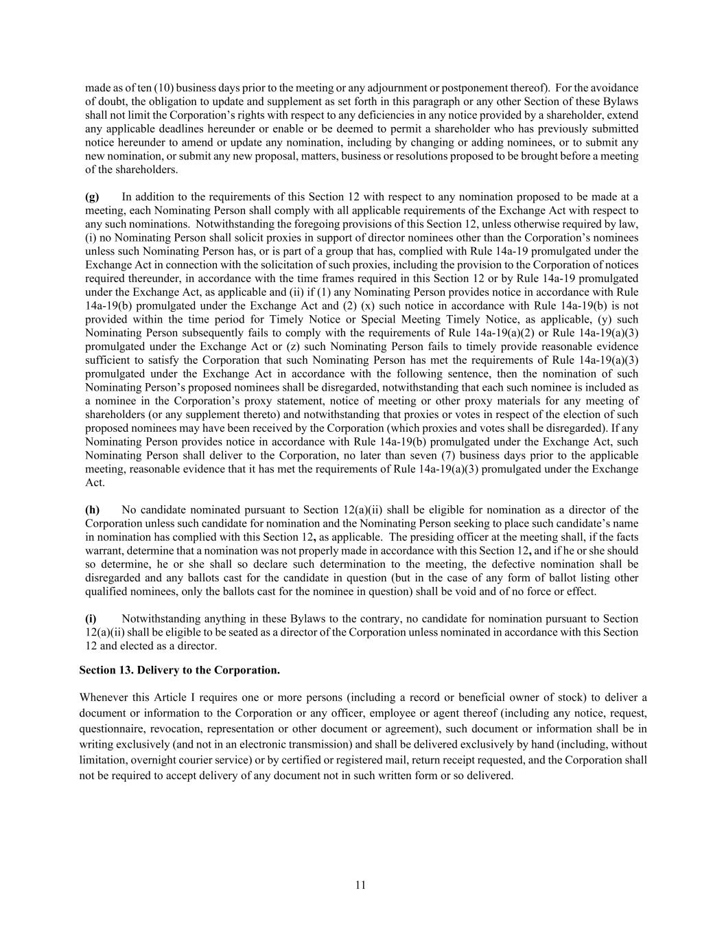 11 made as of ten (10) business days prior to the meeting or any adjournment or postponement thereof). For the avoidance of doubt, the obligation to update and supplement as set forth in this paragraph or any other Section of these Bylaws shall not limit the Corporation’s rights with respect to any deficiencies in any notice provided by a shareholder, extend any applicable deadlines hereunder or enable or be deemed to permit a shareholder who has previously submitted notice hereunder to amend or update any nomination, including by changing or adding nominees, or to submit any new nomination, or submit any new proposal, matters, business or resolutions proposed to be brought before a meeting of the shareholders. (g) In addition to the requirements of this Section 12 with respect to any nomination proposed to be made at a meeting, each Nominating Person shall comply with all applicable requirements of the Exchange Act with respect to any such nominations. Notwithstanding the foregoing provisions of this Section 12, unless otherwise required by law, (i) no Nominating Person shall solicit proxies in support of director nominees other than the Corporation’s nominees unless such Nominating Person has, or is part of a group that has, complied with Rule 14a-19 promulgated under the Exchange Act in connection with the solicitation of such proxies, including the provision to the Corporation of notices required thereunder, in accordance with the time frames required in this Section 12 or by Rule 14a-19 promulgated under the Exchange Act, as applicable and (ii) if (1) any Nominating Person provides notice in accordance with Rule 14a-19(b) promulgated under the Exchange Act and (2) (x) such notice in accordance with Rule 14a-19(b) is not provided within the time period for Timely Notice or Special Meeting Timely Notice, as applicable, (y) such Nominating Person subsequently fails to comply with the requirements of Rule 14a-19(a)(2) or Rule 14a-19(a)(3) promulgated under the Exchange Act or (z) such Nominating Person fails to timely provide reasonable evidence sufficient to satisfy the Corporation that such Nominating Person has met the requirements of Rule 14a-19(a)(3) promulgated under the Exchange Act in accordance with the following sentence, then the nomination of such Nominating Person’s proposed nominees shall be disregarded, notwithstanding that each such nominee is included as a nominee in the Corporation’s proxy statement, notice of meeting or other proxy materials for any meeting of shareholders (or any supplement thereto) and notwithstanding that proxies or votes in respect of the election of such proposed nominees may have been received by the Corporation (which proxies and votes shall be disregarded). If any Nominating Person provides notice in accordance with Rule 14a-19(b) promulgated under the Exchange Act, such Nominating Person shall deliver to the Corporation, no later than seven (7) business days prior to the applicable meeting, reasonable evidence that it has met the requirements of Rule 14a-19(a)(3) promulgated under the Exchange Act. (h) No candidate nominated pursuant to Section 12(a)(ii) shall be eligible for nomination as a director of the Corporation unless such candidate for nomination and the Nominating Person seeking to place such candidate’s name in nomination has complied with this Section 12, as applicable. The presiding officer at the meeting shall, if the facts warrant, determine that a nomination was not properly made in accordance with this Section 12, and if he or she should so determine, he or she shall so declare such determination to the meeting, the defective nomination shall be disregarded and any ballots cast for the candidate in question (but in the case of any form of ballot listing other qualified nominees, only the ballots cast for the nominee in question) shall be void and of no force or effect. (i) Notwithstanding anything in these Bylaws to the contrary, no candidate for nomination pursuant to Section 12(a)(ii) shall be eligible to be seated as a director of the Corporation unless nominated in accordance with this Section 12 and elected as a director. Section 13. Delivery to the Corporation. Whenever this Article I requires one or more persons (including a record or beneficial owner of stock) to deliver a document or information to the Corporation or any officer, employee or agent thereof (including any notice, request, questionnaire, revocation, representation or other document or agreement), such document or information shall be in writing exclusively (and not in an electronic transmission) and shall be delivered exclusively by hand (including, without limitation, overnight courier service) or by certified or registered mail, return receipt requested, and the Corporation shall not be required to accept delivery of any document not in such written form or so delivered.