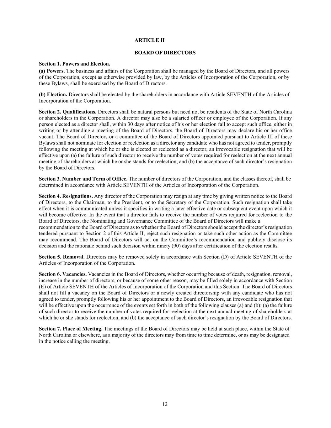 12 Section 1. Powers and Election. ARTICLE II BOARD OF DIRECTORS (a) Powers. The business and affairs of the Corporation shall be managed by the Board of Directors, and all powers of the Corporation, except as otherwise provided by law, by the Articles of Incorporation of the Corporation, or by these Bylaws, shall be exercised by the Board of Directors. (b) Election. Directors shall be elected by the shareholders in accordance with Article SEVENTH of the Articles of Incorporation of the Corporation. Section 2. Qualifications. Directors shall be natural persons but need not be residents of the State of North Carolina or shareholders in the Corporation. A director may also be a salaried officer or employee of the Corporation. If any person elected as a director shall, within 30 days after notice of his or her election fail to accept such office, either in writing or by attending a meeting of the Board of Directors, the Board of Directors may declare his or her office vacant. The Board of Directors or a committee of the Board of Directors appointed pursuant to Article III of these Bylaws shall not nominate for election or reelection as a director any candidate who has not agreed to tender, promptly following the meeting at which he or she is elected or reelected as a director, an irrevocable resignation that will be effective upon (a) the failure of such director to receive the number of votes required for reelection at the next annual meeting of shareholders at which he or she stands for reelection, and (b) the acceptance of such director’s resignation by the Board of Directors. Section 3. Number and Term of Office. The number of directors of the Corporation, and the classes thereof, shall be determined in accordance with Article SEVENTH of the Articles of Incorporation of the Corporation. Section 4. Resignations. Any director of the Corporation may resign at any time by giving written notice to the Board of Directors, to the Chairman, to the President, or to the Secretary of the Corporation. Such resignation shall take effect when it is communicated unless it specifies in writing a later effective date or subsequent event upon which it will become effective. In the event that a director fails to receive the number of votes required for reelection to the Board of Directors, the Nominating and Governance Committee of the Board of Directors will make a recommendation to the Board of Directors as to whether the Board of Directors should accept the director’s resignation tendered pursuant to Section 2 of this Article II, reject such resignation or take such other action as the Committee may recommend. The Board of Directors will act on the Committee’s recommendation and publicly disclose its decision and the rationale behind such decision within ninety (90) days after certification of the election results. Section 5. Removal. Directors may be removed solely in accordance with Section (D) of Article SEVENTH of the Articles of Incorporation of the Corporation. Section 6. Vacancies. Vacancies in the Board of Directors, whether occurring because of death, resignation, removal, increase in the number of directors, or because of some other reason, may be filled solely in accordance with Section (E) of Article SEVENTH of the Articles of Incorporation of the Corporation and this Section. The Board of Directors shall not fill a vacancy on the Board of Directors or a newly created directorship with any candidate who has not agreed to tender, promptly following his or her appointment to the Board of Directors, an irrevocable resignation that will be effective upon the occurrence of the events set forth in both of the following clauses (a) and (b): (a) the failure of such director to receive the number of votes required for reelection at the next annual meeting of shareholders at which he or she stands for reelection, and (b) the acceptance of such director’s resignation by the Board of Directors. Section 7. Place of Meeting. The meetings of the Board of Directors may be held at such place, within the State of North Carolina or elsewhere, as a majority of the directors may from time to time determine, or as may be designated in the notice calling the meeting.