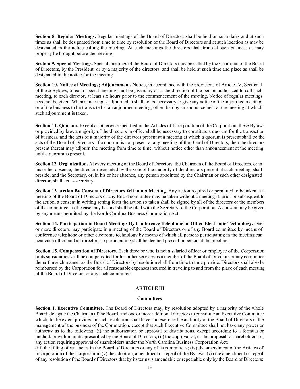 13 Section 8. Regular Meetings. Regular meetings of the Board of Directors shall be held on such dates and at such times as shall be designated from time to time by resolution of the Board of Directors and at such location as may be designated in the notice calling the meeting. At such meetings the directors shall transact such business as may properly be brought before the meeting. Section 9. Special Meetings. Special meetings of the Board of Directors may be called by the Chairman of the Board of Directors, by the President, or by a majority of the directors, and shall be held at such time and place as shall be designated in the notice for the meeting. Section 10. Notice of Meetings; Adjournment. Notice, in accordance with the provisions of Article IV, Section 1 of these Bylaws, of each special meeting shall be given, by or at the direction of the person authorized to call such meeting, to each director, at least six hours prior to the commencement of the meeting. Notice of regular meetings need not be given. When a meeting is adjourned, it shall not be necessary to give any notice of the adjourned meeting, or of the business to be transacted at an adjourned meeting, other than by an announcement at the meeting at which such adjournment is taken. Section 11. Quorum. Except as otherwise specified in the Articles of Incorporation of the Corporation, these Bylaws or provided by law, a majority of the directors in office shall be necessary to constitute a quorum for the transaction of business, and the acts of a majority of the directors present at a meeting at which a quorum is present shall be the acts of the Board of Directors. If a quorum is not present at any meeting of the Board of Directors, then the directors present thereat may adjourn the meeting from time to time, without notice other than announcement at the meeting, until a quorum is present. Section 12. Organization. At every meeting of the Board of Directors, the Chairman of the Board of Directors, or in his or her absence, the director designated by the vote of the majority of the directors present at such meeting, shall preside, and the Secretary, or, in his or her absence, any person appointed by the Chairman or such other designated director, shall act as secretary. Section 13. Action By Consent of Directors Without a Meeting. Any action required or permitted to be taken at a meeting of the Board of Directors or any Board committee may be taken without a meeting if, prior or subsequent to the action, a consent in writing setting forth the action so taken shall be signed by all of the directors or the members of the committee, as the case may be, and shall be filed with the Secretary of the Corporation. A consent may be given by any means permitted by the North Carolina Business Corporation Act. Section 14. Participation in Board Meetings By Conference Telephone or Other Electronic Technology. One or more directors may participate in a meeting of the Board of Directors or of any Board committee by means of conference telephone or other electronic technology by means of which all persons participating in the meeting can hear each other, and all directors so participating shall be deemed present in person at the meeting. Section 15. Compensation of Directors. Each director who is not a salaried officer or employee of the Corporation or its subsidiaries shall be compensated for his or her services as a member of the Board of Directors or any committee thereof in such manner as the Board of Directors by resolution shall from time to time provide. Directors shall also be reimbursed by the Corporation for all reasonable expenses incurred in traveling to and from the place of each meeting of the Board of Directors or any such committee. ARTICLE III Committees Section 1. Executive Committee. The Board of Directors may, by resolution adopted by a majority of the whole Board, delegate the Chairman of the Board, and one or more additional directors to constitute an Executive Committee which, to the extent provided in such resolution, shall have and exercise the authority of the Board of Directors in the management of the business of the Corporation, except that such Executive Committee shall not have any power or authority as to the following: (i) the authorization or approval of distributions, except according to a formula or method, or within limits, prescribed by the Board of Directors; (ii) the approval of, or the proposal to shareholders of, any action requiring approval of shareholders under the North Carolina Business Corporation Act; (iii) the filling of vacancies in the Board of Directors or any of its committees; (iv) the amendment of the Articles of Incorporation of the Corporation; (v) the adoption, amendment or repeal of the Bylaws; (vi) the amendment or repeal of any resolution of the Board of Directors that by its terms is amendable or repealable only by the Board of Directors;
