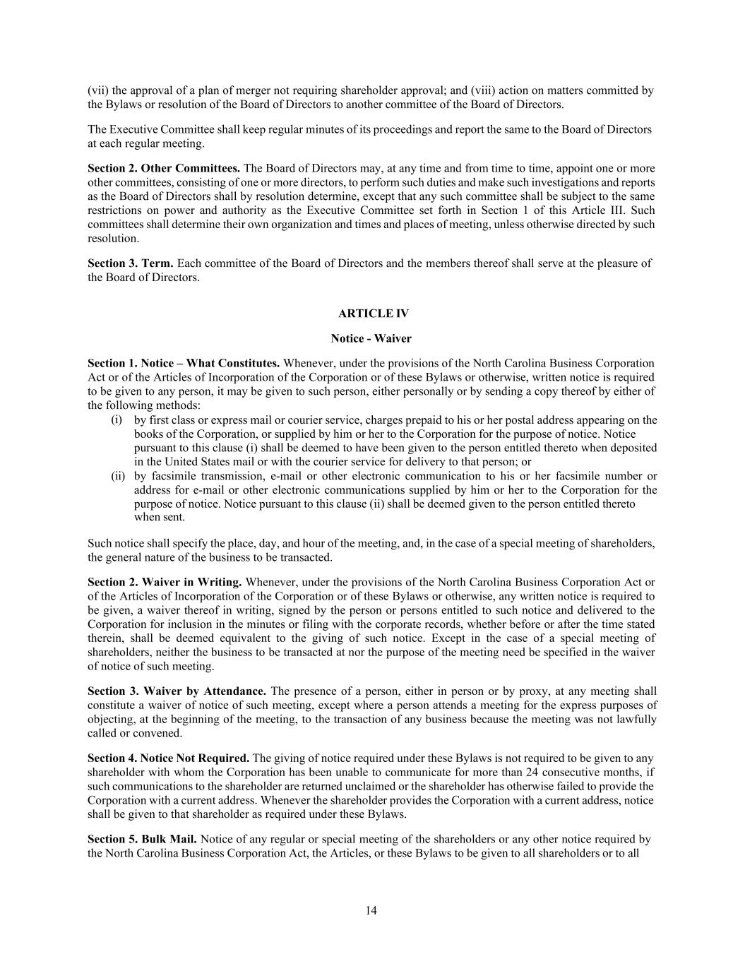14 (vii) the approval of a plan of merger not requiring shareholder approval; and (viii) action on matters committed by the Bylaws or resolution of the Board of Directors to another committee of the Board of Directors. The Executive Committee shall keep regular minutes of its proceedings and report the same to the Board of Directors at each regular meeting. Section 2. Other Committees. The Board of Directors may, at any time and from time to time, appoint one or more other committees, consisting of one or more directors, to perform such duties and make such investigations and reports as the Board of Directors shall by resolution determine, except that any such committee shall be subject to the same restrictions on power and authority as the Executive Committee set forth in Section 1 of this Article III. Such committees shall determine their own organization and times and places of meeting, unless otherwise directed by such resolution. Section 3. Term. Each committee of the Board of Directors and the members thereof shall serve at the pleasure of the Board of Directors. ARTICLE IV Notice - Waiver Section 1. Notice – What Constitutes. Whenever, under the provisions of the North Carolina Business Corporation Act or of the Articles of Incorporation of the Corporation or of these Bylaws or otherwise, written notice is required to be given to any person, it may be given to such person, either personally or by sending a copy thereof by either of the following methods: (i) by first class or express mail or courier service, charges prepaid to his or her postal address appearing on the books of the Corporation, or supplied by him or her to the Corporation for the purpose of notice. Notice pursuant to this clause (i) shall be deemed to have been given to the person entitled thereto when deposited in the United States mail or with the courier service for delivery to that person; or (ii) by facsimile transmission, e-mail or other electronic communication to his or her facsimile number or address for e-mail or other electronic communications supplied by him or her to the Corporation for the purpose of notice. Notice pursuant to this clause (ii) shall be deemed given to the person entitled thereto when sent. Such notice shall specify the place, day, and hour of the meeting, and, in the case of a special meeting of shareholders, the general nature of the business to be transacted. Section 2. Waiver in Writing. Whenever, under the provisions of the North Carolina Business Corporation Act or of the Articles of Incorporation of the Corporation or of these Bylaws or otherwise, any written notice is required to be given, a waiver thereof in writing, signed by the person or persons entitled to such notice and delivered to the Corporation for inclusion in the minutes or filing with the corporate records, whether before or after the time stated therein, shall be deemed equivalent to the giving of such notice. Except in the case of a special meeting of shareholders, neither the business to be transacted at nor the purpose of the meeting need be specified in the waiver of notice of such meeting. Section 3. Waiver by Attendance. The presence of a person, either in person or by proxy, at any meeting shall constitute a waiver of notice of such meeting, except where a person attends a meeting for the express purposes of objecting, at the beginning of the meeting, to the transaction of any business because the meeting was not lawfully called or convened. Section 4. Notice Not Required. The giving of notice required under these Bylaws is not required to be given to any shareholder with whom the Corporation has been unable to communicate for more than 24 consecutive months, if such communications to the shareholder are returned unclaimed or the shareholder has otherwise failed to provide the Corporation with a current address. Whenever the shareholder provides the Corporation with a current address, notice shall be given to that shareholder as required under these Bylaws. Section 5. Bulk Mail. Notice of any regular or special meeting of the shareholders or any other notice required by the North Carolina Business Corporation Act, the Articles, or these Bylaws to be given to all shareholders or to all