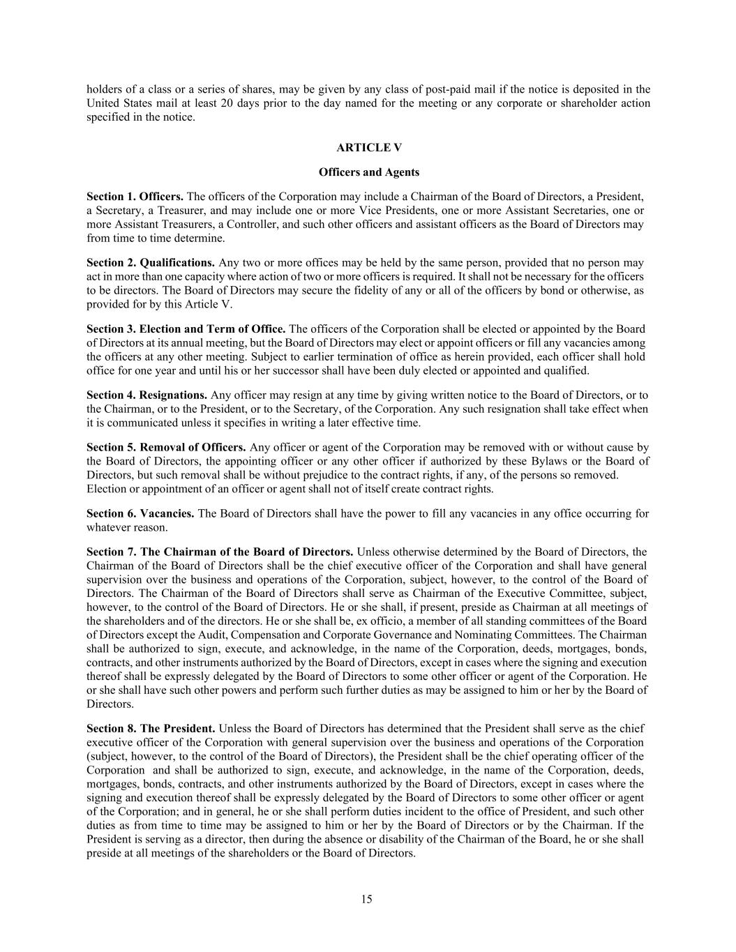 15 holders of a class or a series of shares, may be given by any class of post-paid mail if the notice is deposited in the United States mail at least 20 days prior to the day named for the meeting or any corporate or shareholder action specified in the notice. ARTICLE V Officers and Agents Section 1. Officers. The officers of the Corporation may include a Chairman of the Board of Directors, a President, a Secretary, a Treasurer, and may include one or more Vice Presidents, one or more Assistant Secretaries, one or more Assistant Treasurers, a Controller, and such other officers and assistant officers as the Board of Directors may from time to time determine. Section 2. Qualifications. Any two or more offices may be held by the same person, provided that no person may act in more than one capacity where action of two or more officers is required. It shall not be necessary for the officers to be directors. The Board of Directors may secure the fidelity of any or all of the officers by bond or otherwise, as provided for by this Article V. Section 3. Election and Term of Office. The officers of the Corporation shall be elected or appointed by the Board of Directors at its annual meeting, but the Board of Directors may elect or appoint officers or fill any vacancies among the officers at any other meeting. Subject to earlier termination of office as herein provided, each officer shall hold office for one year and until his or her successor shall have been duly elected or appointed and qualified. Section 4. Resignations. Any officer may resign at any time by giving written notice to the Board of Directors, or to the Chairman, or to the President, or to the Secretary, of the Corporation. Any such resignation shall take effect when it is communicated unless it specifies in writing a later effective time. Section 5. Removal of Officers. Any officer or agent of the Corporation may be removed with or without cause by the Board of Directors, the appointing officer or any other officer if authorized by these Bylaws or the Board of Directors, but such removal shall be without prejudice to the contract rights, if any, of the persons so removed. Election or appointment of an officer or agent shall not of itself create contract rights. Section 6. Vacancies. The Board of Directors shall have the power to fill any vacancies in any office occurring for whatever reason. Section 7. The Chairman of the Board of Directors. Unless otherwise determined by the Board of Directors, the Chairman of the Board of Directors shall be the chief executive officer of the Corporation and shall have general supervision over the business and operations of the Corporation, subject, however, to the control of the Board of Directors. The Chairman of the Board of Directors shall serve as Chairman of the Executive Committee, subject, however, to the control of the Board of Directors. He or she shall, if present, preside as Chairman at all meetings of the shareholders and of the directors. He or she shall be, ex officio, a member of all standing committees of the Board of Directors except the Audit, Compensation and Corporate Governance and Nominating Committees. The Chairman shall be authorized to sign, execute, and acknowledge, in the name of the Corporation, deeds, mortgages, bonds, contracts, and other instruments authorized by the Board of Directors, except in cases where the signing and execution thereof shall be expressly delegated by the Board of Directors to some other officer or agent of the Corporation. He or she shall have such other powers and perform such further duties as may be assigned to him or her by the Board of Directors. Section 8. The President. Unless the Board of Directors has determined that the President shall serve as the chief executive officer of the Corporation with general supervision over the business and operations of the Corporation (subject, however, to the control of the Board of Directors), the President shall be the chief operating officer of the Corporation and shall be authorized to sign, execute, and acknowledge, in the name of the Corporation, deeds, mortgages, bonds, contracts, and other instruments authorized by the Board of Directors, except in cases where the signing and execution thereof shall be expressly delegated by the Board of Directors to some other officer or agent of the Corporation; and in general, he or she shall perform duties incident to the office of President, and such other duties as from time to time may be assigned to him or her by the Board of Directors or by the Chairman. If the President is serving as a director, then during the absence or disability of the Chairman of the Board, he or she shall preside at all meetings of the shareholders or the Board of Directors.