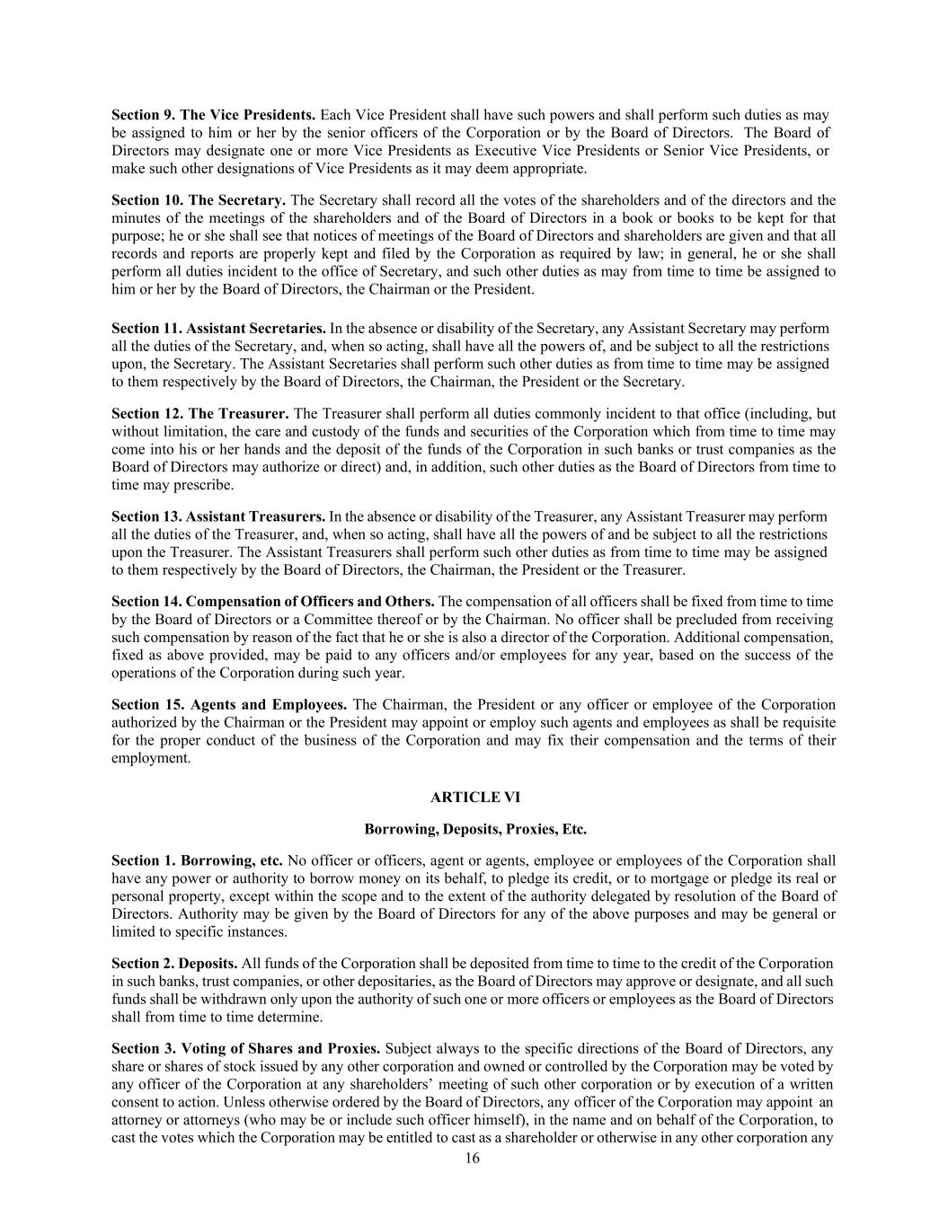 16 Section 9. The Vice Presidents. Each Vice President shall have such powers and shall perform such duties as may be assigned to him or her by the senior officers of the Corporation or by the Board of Directors. The Board of Directors may designate one or more Vice Presidents as Executive Vice Presidents or Senior Vice Presidents, or make such other designations of Vice Presidents as it may deem appropriate. Section 10. The Secretary. The Secretary shall record all the votes of the shareholders and of the directors and the minutes of the meetings of the shareholders and of the Board of Directors in a book or books to be kept for that purpose; he or she shall see that notices of meetings of the Board of Directors and shareholders are given and that all records and reports are properly kept and filed by the Corporation as required by law; in general, he or she shall perform all duties incident to the office of Secretary, and such other duties as may from time to time be assigned to him or her by the Board of Directors, the Chairman or the President. Section 11. Assistant Secretaries. In the absence or disability of the Secretary, any Assistant Secretary may perform all the duties of the Secretary, and, when so acting, shall have all the powers of, and be subject to all the restrictions upon, the Secretary. The Assistant Secretaries shall perform such other duties as from time to time may be assigned to them respectively by the Board of Directors, the Chairman, the President or the Secretary. Section 12. The Treasurer. The Treasurer shall perform all duties commonly incident to that office (including, but without limitation, the care and custody of the funds and securities of the Corporation which from time to time may come into his or her hands and the deposit of the funds of the Corporation in such banks or trust companies as the Board of Directors may authorize or direct) and, in addition, such other duties as the Board of Directors from time to time may prescribe. Section 13. Assistant Treasurers. In the absence or disability of the Treasurer, any Assistant Treasurer may perform all the duties of the Treasurer, and, when so acting, shall have all the powers of and be subject to all the restrictions upon the Treasurer. The Assistant Treasurers shall perform such other duties as from time to time may be assigned to them respectively by the Board of Directors, the Chairman, the President or the Treasurer. Section 14. Compensation of Officers and Others. The compensation of all officers shall be fixed from time to time by the Board of Directors or a Committee thereof or by the Chairman. No officer shall be precluded from receiving such compensation by reason of the fact that he or she is also a director of the Corporation. Additional compensation, fixed as above provided, may be paid to any officers and/or employees for any year, based on the success of the operations of the Corporation during such year. Section 15. Agents and Employees. The Chairman, the President or any officer or employee of the Corporation authorized by the Chairman or the President may appoint or employ such agents and employees as shall be requisite for the proper conduct of the business of the Corporation and may fix their compensation and the terms of their employment. ARTICLE VI Borrowing, Deposits, Proxies, Etc. Section 1. Borrowing, etc. No officer or officers, agent or agents, employee or employees of the Corporation shall have any power or authority to borrow money on its behalf, to pledge its credit, or to mortgage or pledge its real or personal property, except within the scope and to the extent of the authority delegated by resolution of the Board of Directors. Authority may be given by the Board of Directors for any of the above purposes and may be general or limited to specific instances. Section 2. Deposits. All funds of the Corporation shall be deposited from time to time to the credit of the Corporation in such banks, trust companies, or other depositaries, as the Board of Directors may approve or designate, and all such funds shall be withdrawn only upon the authority of such one or more officers or employees as the Board of Directors shall from time to time determine. Section 3. Voting of Shares and Proxies. Subject always to the specific directions of the Board of Directors, any share or shares of stock issued by any other corporation and owned or controlled by the Corporation may be voted by any officer of the Corporation at any shareholders’ meeting of such other corporation or by execution of a written consent to action. Unless otherwise ordered by the Board of Directors, any officer of the Corporation may appoint an attorney or attorneys (who may be or include such officer himself), in the name and on behalf of the Corporation, to cast the votes which the Corporation may be entitled to cast as a shareholder or otherwise in any other corporation any