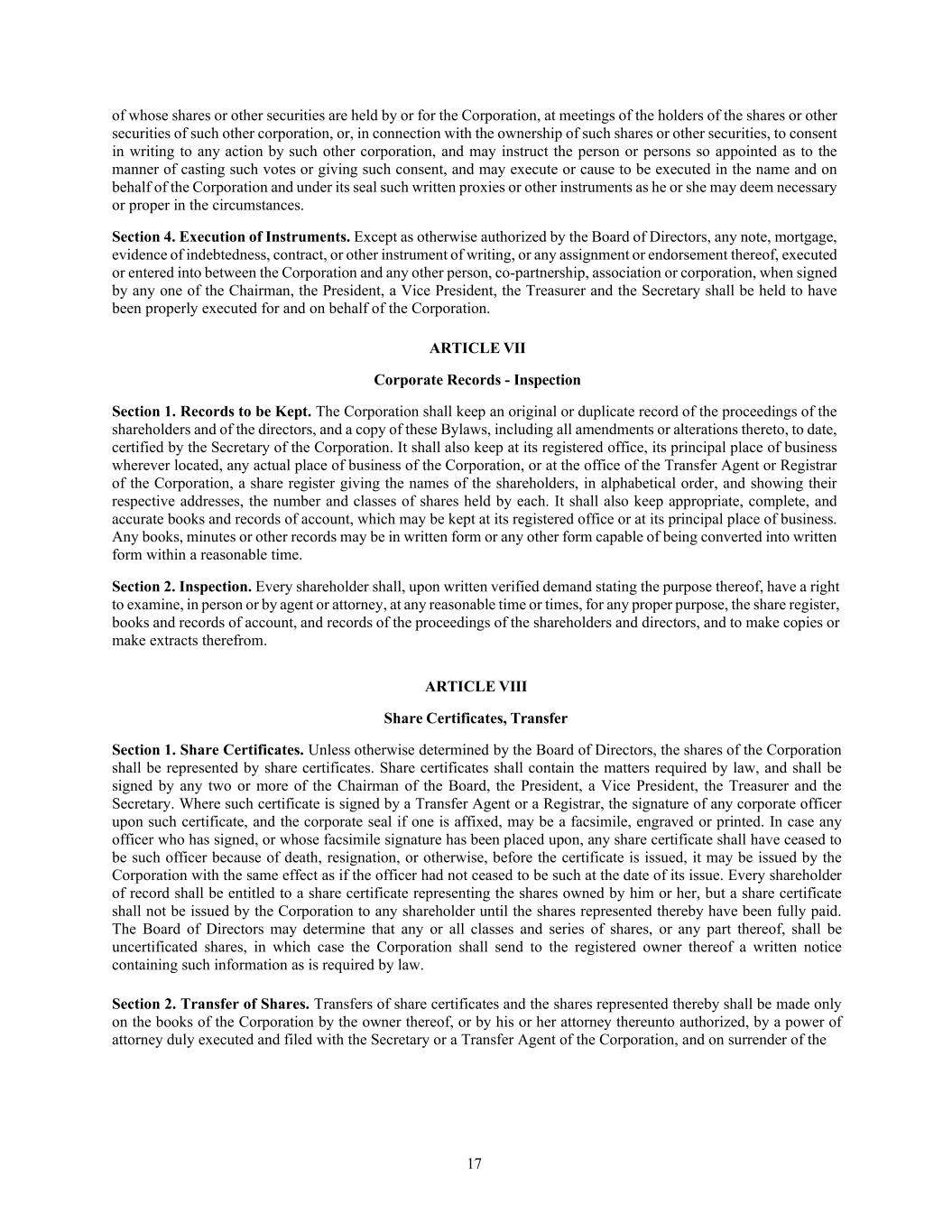 17 of whose shares or other securities are held by or for the Corporation, at meetings of the holders of the shares or other securities of such other corporation, or, in connection with the ownership of such shares or other securities, to consent in writing to any action by such other corporation, and may instruct the person or persons so appointed as to the manner of casting such votes or giving such consent, and may execute or cause to be executed in the name and on behalf of the Corporation and under its seal such written proxies or other instruments as he or she may deem necessary or proper in the circumstances. Section 4. Execution of Instruments. Except as otherwise authorized by the Board of Directors, any note, mortgage, evidence of indebtedness, contract, or other instrument of writing, or any assignment or endorsement thereof, executed or entered into between the Corporation and any other person, co-partnership, association or corporation, when signed by any one of the Chairman, the President, a Vice President, the Treasurer and the Secretary shall be held to have been properly executed for and on behalf of the Corporation. ARTICLE VII Corporate Records - Inspection Section 1. Records to be Kept. The Corporation shall keep an original or duplicate record of the proceedings of the shareholders and of the directors, and a copy of these Bylaws, including all amendments or alterations thereto, to date, certified by the Secretary of the Corporation. It shall also keep at its registered office, its principal place of business wherever located, any actual place of business of the Corporation, or at the office of the Transfer Agent or Registrar of the Corporation, a share register giving the names of the shareholders, in alphabetical order, and showing their respective addresses, the number and classes of shares held by each. It shall also keep appropriate, complete, and accurate books and records of account, which may be kept at its registered office or at its principal place of business. Any books, minutes or other records may be in written form or any other form capable of being converted into written form within a reasonable time. Section 2. Inspection. Every shareholder shall, upon written verified demand stating the purpose thereof, have a right to examine, in person or by agent or attorney, at any reasonable time or times, for any proper purpose, the share register, books and records of account, and records of the proceedings of the shareholders and directors, and to make copies or make extracts therefrom. ARTICLE VIII Share Certificates, Transfer Section 1. Share Certificates. Unless otherwise determined by the Board of Directors, the shares of the Corporation shall be represented by share certificates. Share certificates shall contain the matters required by law, and shall be signed by any two or more of the Chairman of the Board, the President, a Vice President, the Treasurer and the Secretary. Where such certificate is signed by a Transfer Agent or a Registrar, the signature of any corporate officer upon such certificate, and the corporate seal if one is affixed, may be a facsimile, engraved or printed. In case any officer who has signed, or whose facsimile signature has been placed upon, any share certificate shall have ceased to be such officer because of death, resignation, or otherwise, before the certificate is issued, it may be issued by the Corporation with the same effect as if the officer had not ceased to be such at the date of its issue. Every shareholder of record shall be entitled to a share certificate representing the shares owned by him or her, but a share certificate shall not be issued by the Corporation to any shareholder until the shares represented thereby have been fully paid. The Board of Directors may determine that any or all classes and series of shares, or any part thereof, shall be uncertificated shares, in which case the Corporation shall send to the registered owner thereof a written notice containing such information as is required by law. Section 2. Transfer of Shares. Transfers of share certificates and the shares represented thereby shall be made only on the books of the Corporation by the owner thereof, or by his or her attorney thereunto authorized, by a power of attorney duly executed and filed with the Secretary or a Transfer Agent of the Corporation, and on surrender of the