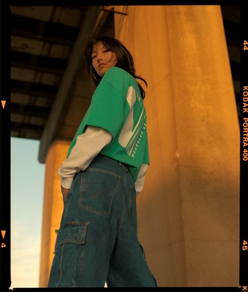 Drawing on Wrangler’s long western heritage, and the street style looks it embraced in the 1980s and 1990s, the Value collection features a sizing philosophy that allows for all identities to wear the collection. Checked shirts, and short and long-sleeved tees with bold graphics are paired with a hooded popper jacket displaying retro color-blocking in shell-suit fabric. Denim jackets are boxy, and jeans, dungarees and denim cargo pants go wide. Zip-off sleeves on jackets and legs on jeans change the look, in a play on experimental wearability and practicality.