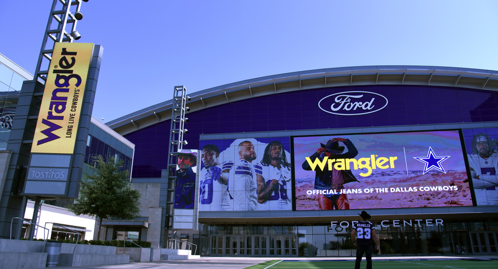 “The ethos of the Wrangler brand is already inherently embedded in the lifestyle of Cowboys players and fans. It is clear we are simply honoring a shared bond and mutual fandom displayed inside and outside our stadium for years,” says John Hickman, vice president of business development for the Dallas Cowboys. “It is going to be fun to watch the fans embrace this sponsorship by one of denim’s most iconic brands.”